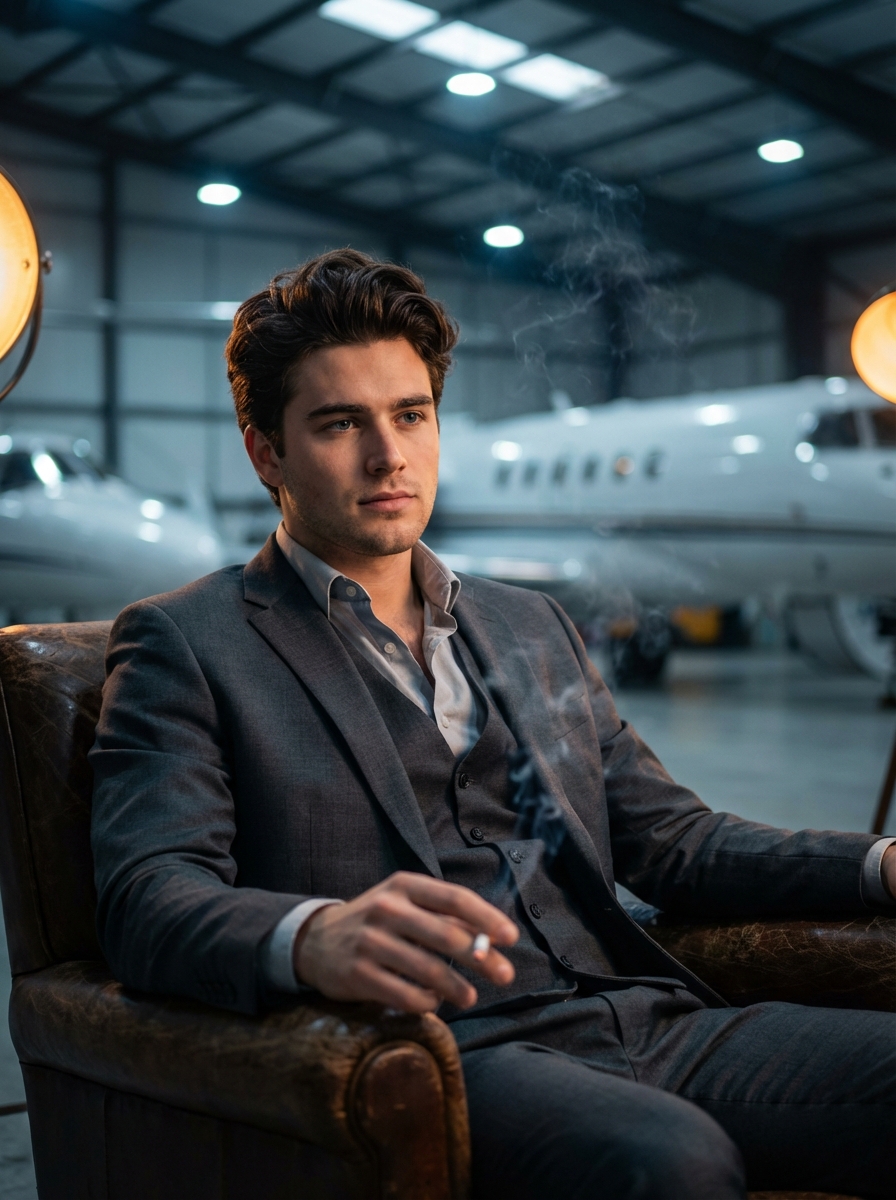 {"Objective": "Generate a high-end cinematic portrait of a confident young model in a luxury aviation setting.", "Subject": {"Gender": "Male", "Age_Group": "Early 20s", "Appearance": {"Eyes": "Deep, piercing crystal blue eyes, highly detailed iris", "Skin": {"Texture": "Smooth, realistic skin pores", "Details": "Clean-shaven, sharp jawline", "Makeup": "None"}, "Hair": {"Style": "Modern textured quiff, voluminous", "Details": "Perfectly groomed, dark brown with subtle highlights"}, "Expression": "Confident, dashy, slightly mysterious gaze"}}, "Wardrobe": {"Clothing": "Tailored charcoal grey slim-fit three-piece suit, crisp shirt unbuttoned at the collar", "Style": "Ultra-modern luxury, 'Old Money' aesthetic"}, "Lighting": {"Type": "Cinematic hangar lighting", "Quality": ["Soft rim lighting to separate subject from background", "Cool-toned overhead industrial lights mixed with warm amber accent lights"]}, "Camera_and_Technical": {"Camera_Style": "Professional Fashion Editorial", "Lens": "35mm wide-angle lens", "Aperture": "f/1.8", "Focus": "Sharp focus on the subject's face", "Depth_of_Field": "Shallow depth of field with soft bokeh on the jets in the background"}, "Visual_Style": {"Aesthetic": "Hyper-realistic, moody, and sophisticated", "Resolution": "8k UHD", "Color_Grading": {"Palette": ["Deep Navy", "Steel Grey", "Golden Amber"], "Style": "High contrast, teal and orange cinematic tint"}}, "Additional_Details": "The model is sitting in a vintage leather armchair in the middle of a massive hangar. Wisps of cigarette smoke are curling elegantly into the air. Multiple sleek, polished private jets are visible in the background."}