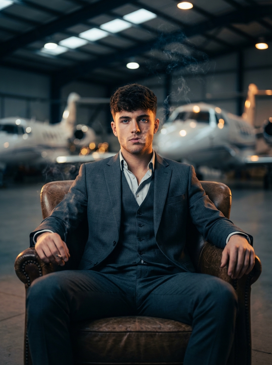 {"Objective": "Generate a high-end cinematic portrait of a confident young model in a luxury aviation setting.", "Subject": {"Gender": "Male", "Age_Group": "Early 20s", "Appearance": {"Eyes": "Deep, piercing crystal blue eyes, highly detailed iris", "Skin": {"Texture": "Smooth, realistic skin pores", "Details": "Clean-shaven, sharp jawline", "Makeup": "None"}, "Hair": {"Style": "Modern textured quiff, voluminous", "Details": "Perfectly groomed, dark brown with subtle highlights"}, "Expression": "Confident, dashy, slightly mysterious gaze"}}, "Wardrobe": {"Clothing": "Tailored charcoal grey slim-fit three-piece suit, crisp shirt unbuttoned at the collar", "Style": "Ultra-modern luxury, 'Old Money' aesthetic"}, "Lighting": {"Type": "Cinematic hangar lighting", "Quality": ["Soft rim lighting to separate subject from background", "Cool-toned overhead industrial lights mixed with warm amber accent lights"]}, "Camera_and_Technical": {"Camera_Style": "Professional Fashion Editorial", "Lens": "35mm wide-angle lens", "Aperture": "f/1.8", "Focus": "Sharp focus on the subject's face", "Depth_of_Field": "Shallow depth of field with soft bokeh on the jets in the background"}, "Visual_Style": {"Aesthetic": "Hyper-realistic, moody, and sophisticated", "Resolution": "8k UHD", "Color_Grading": {"Palette": ["Deep Navy", "Steel Grey", "Golden Amber"], "Style": "High contrast, teal and orange cinematic tint"}}, "Additional_Details": "The model is sitting in a vintage leather armchair in the middle of a massive hangar. Wisps of cigarette smoke are curling elegantly into the air. Multiple sleek, polished private jets are visible in the background."}