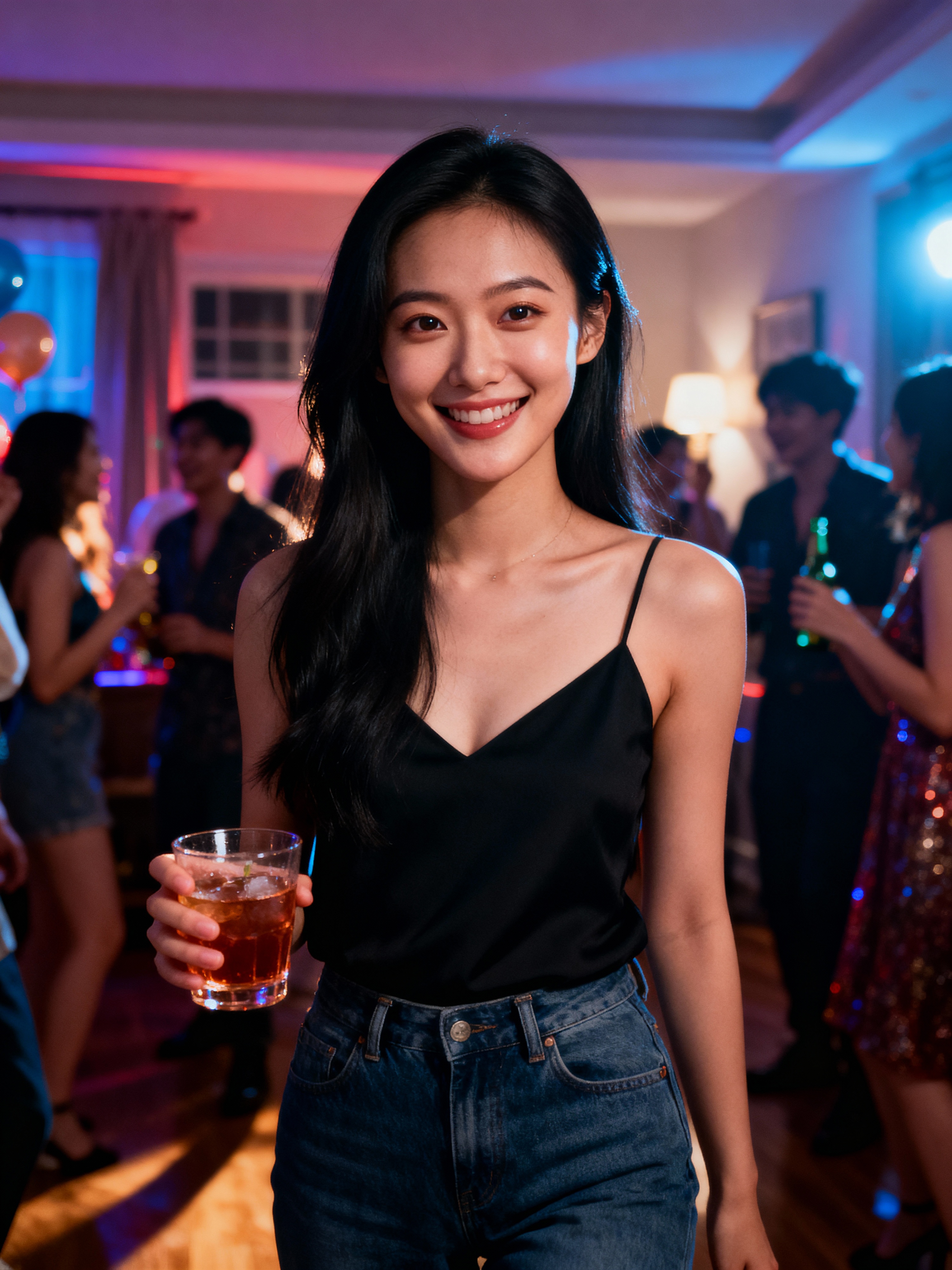 outgoing feminine model at a lively house party, holding a drink and smiling