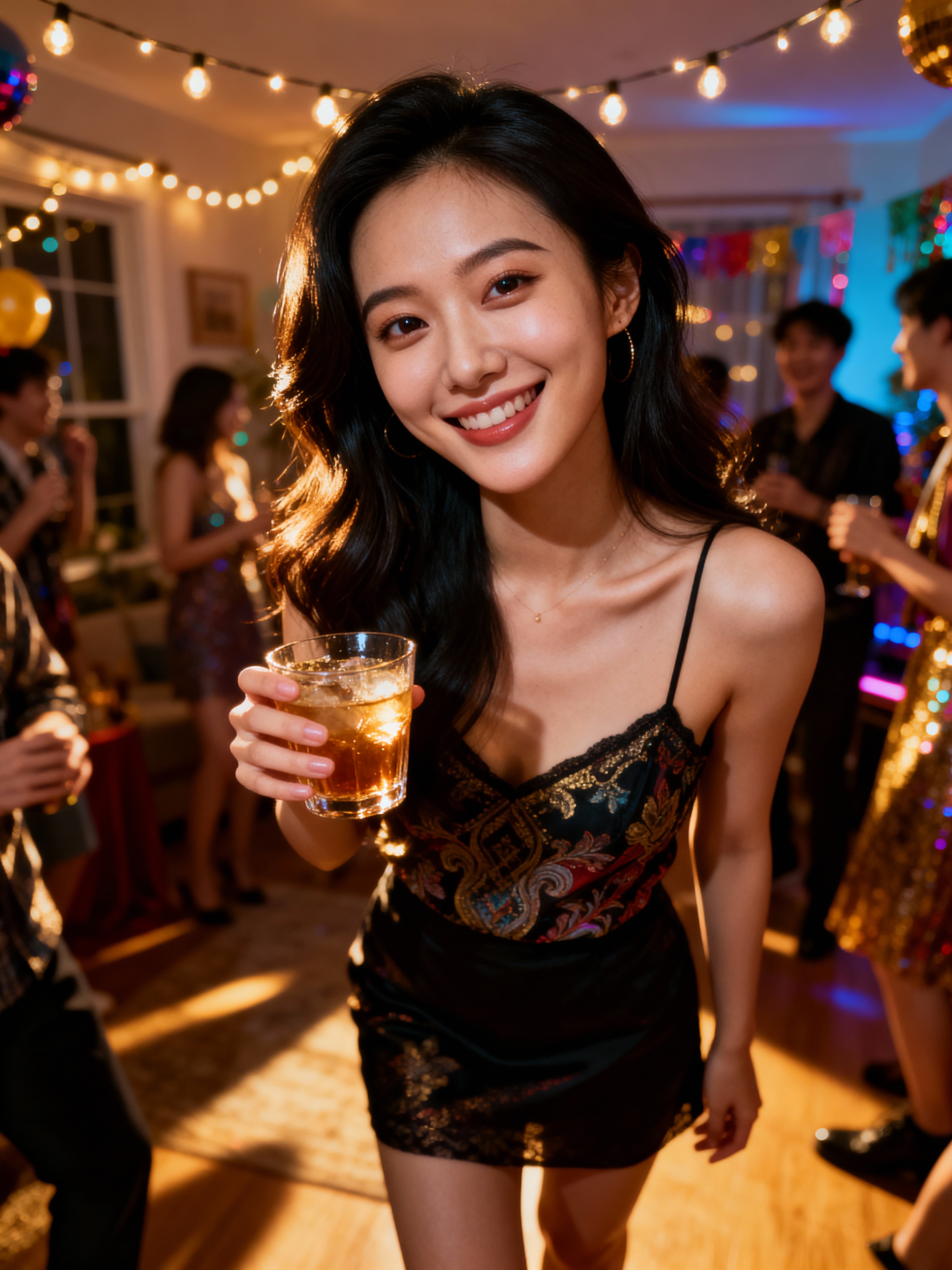 outgoing feminine model at a lively house party, holding a drink and smiling