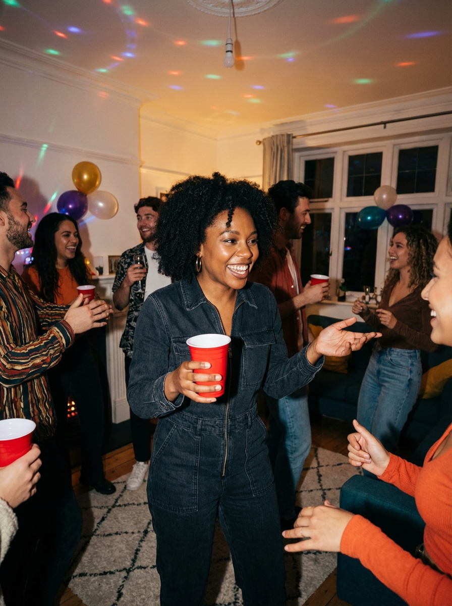 outgoing feminine model at a lively house party, holding a drink and smiling