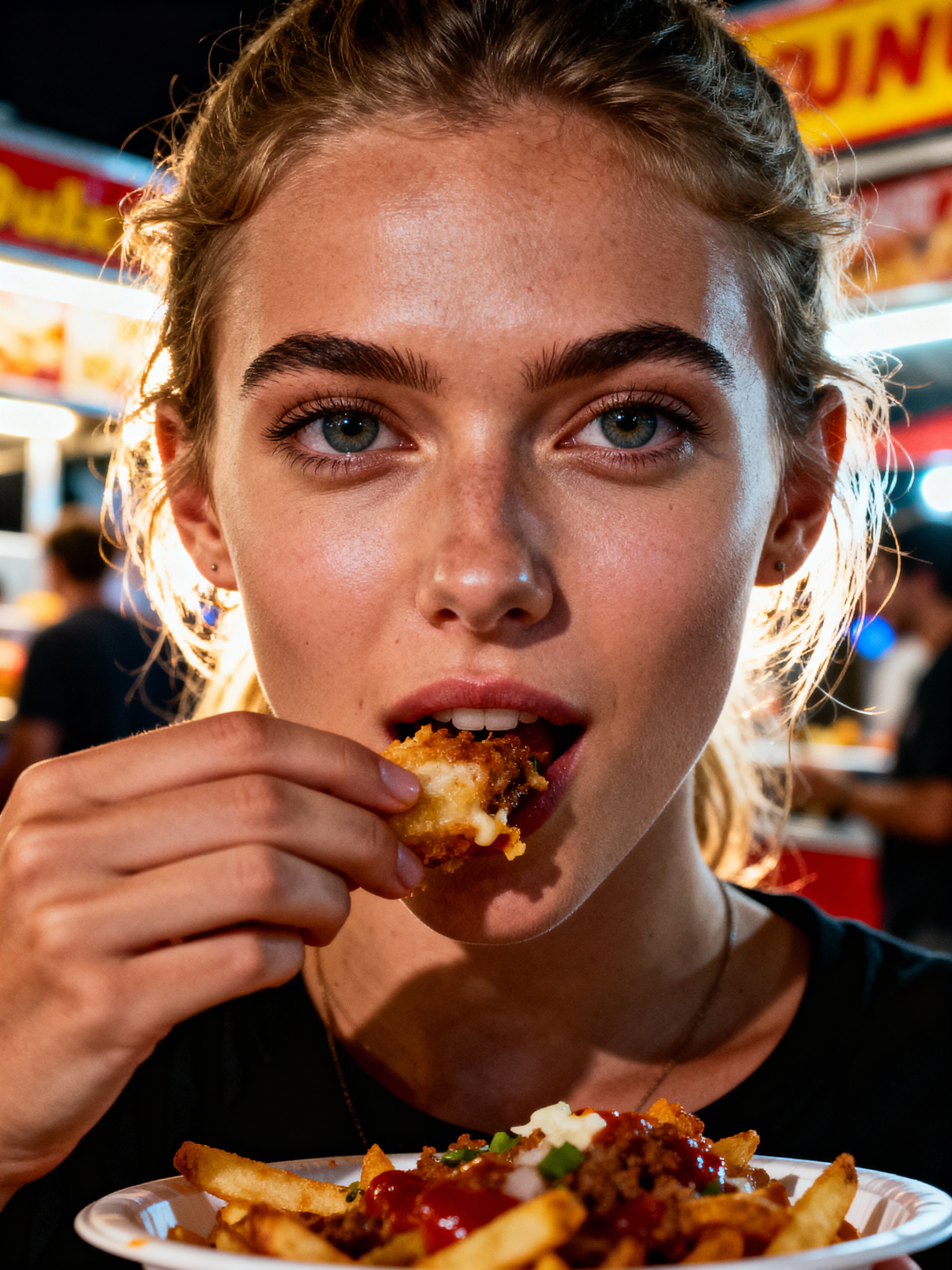 outgoing feminine model savoring street food at a local food truck event