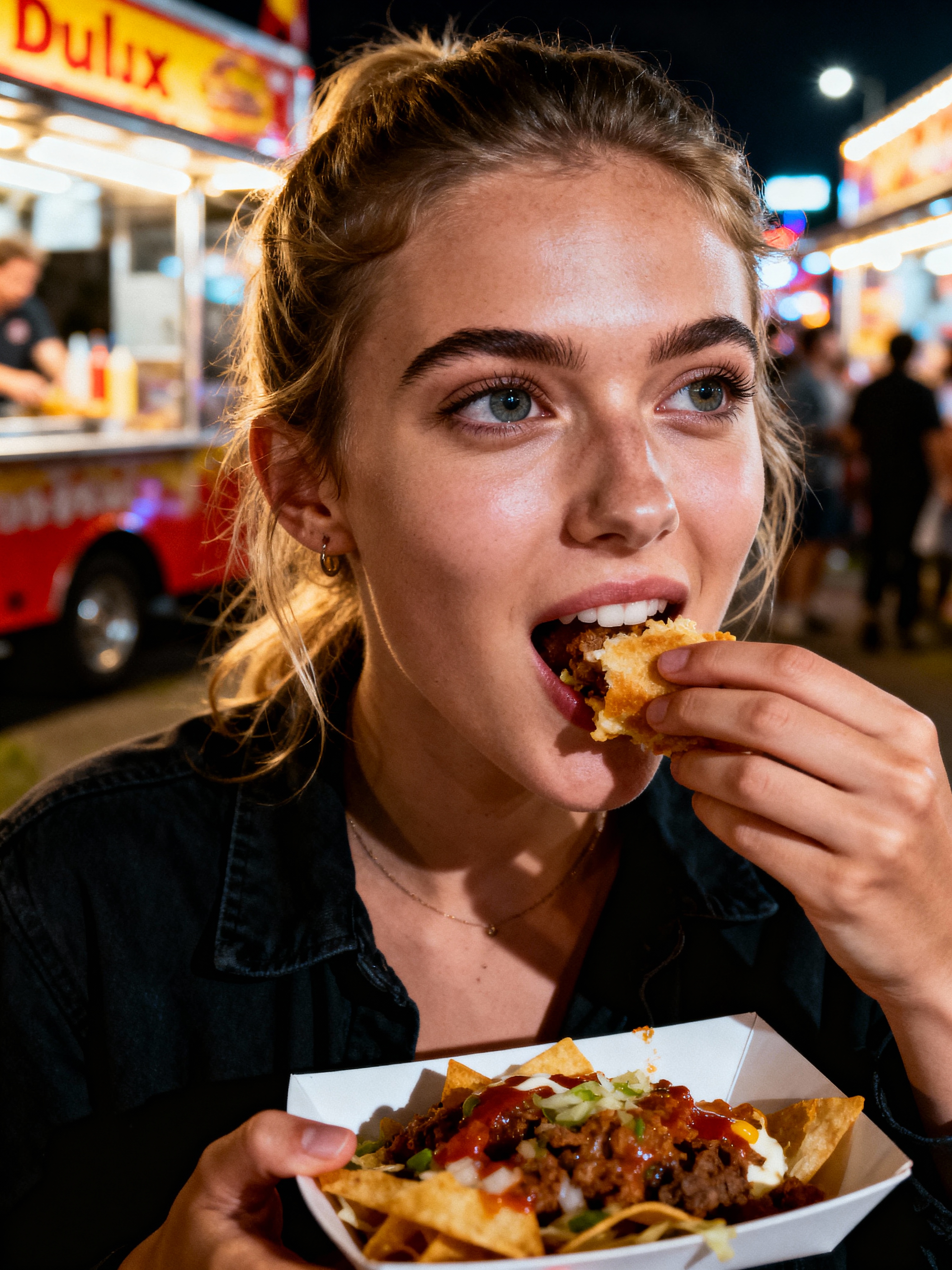 outgoing feminine model savoring street food at a local food truck event