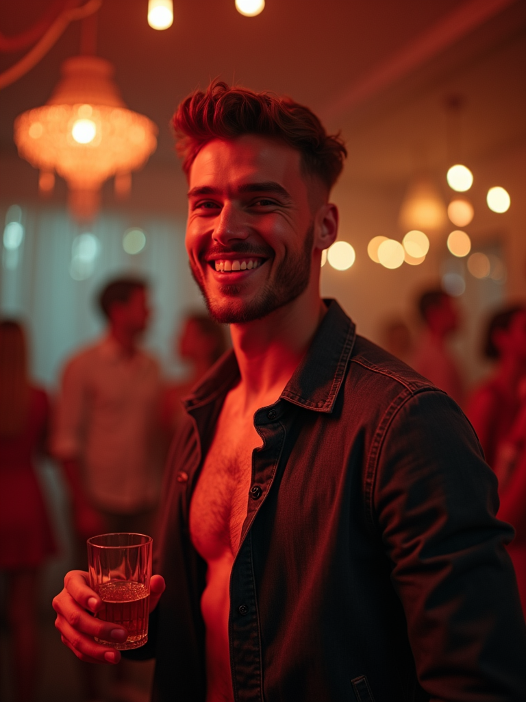 outgoing masculine model at a lively house party, holding a drink and smiling