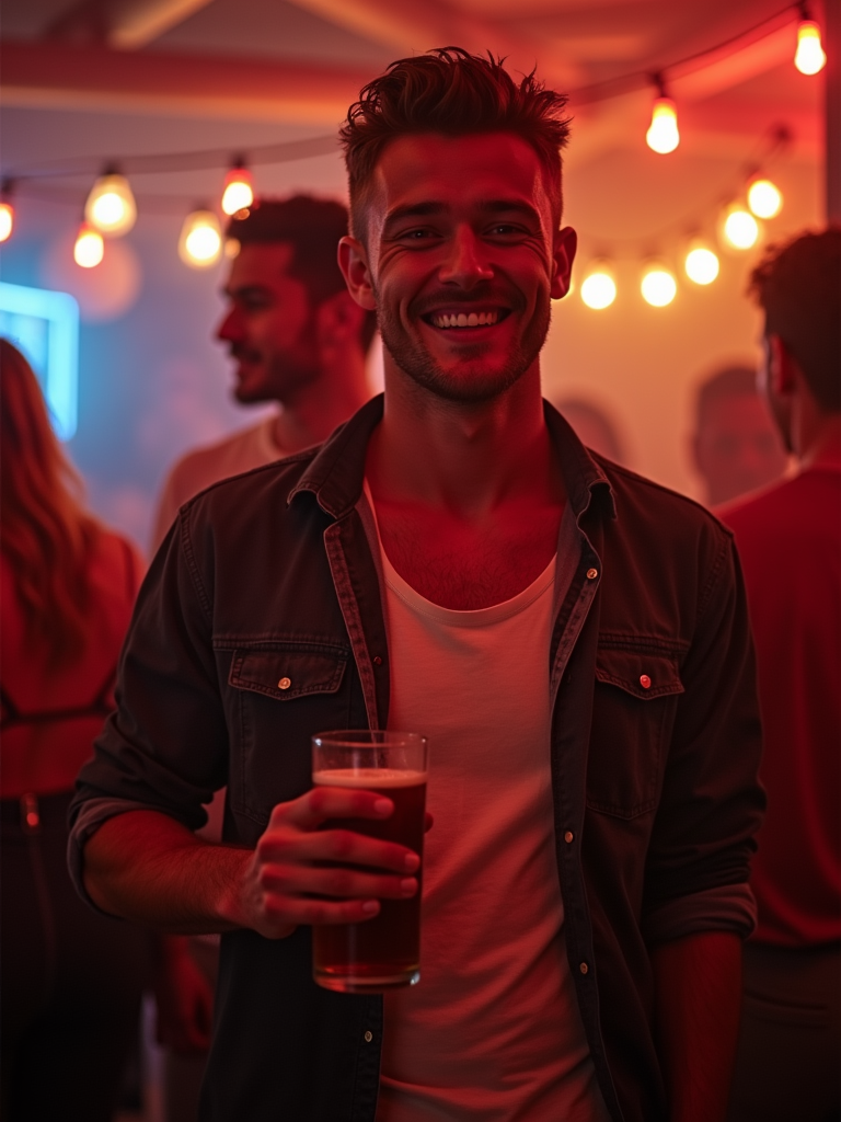 outgoing masculine model at a lively house party, holding a drink and smiling