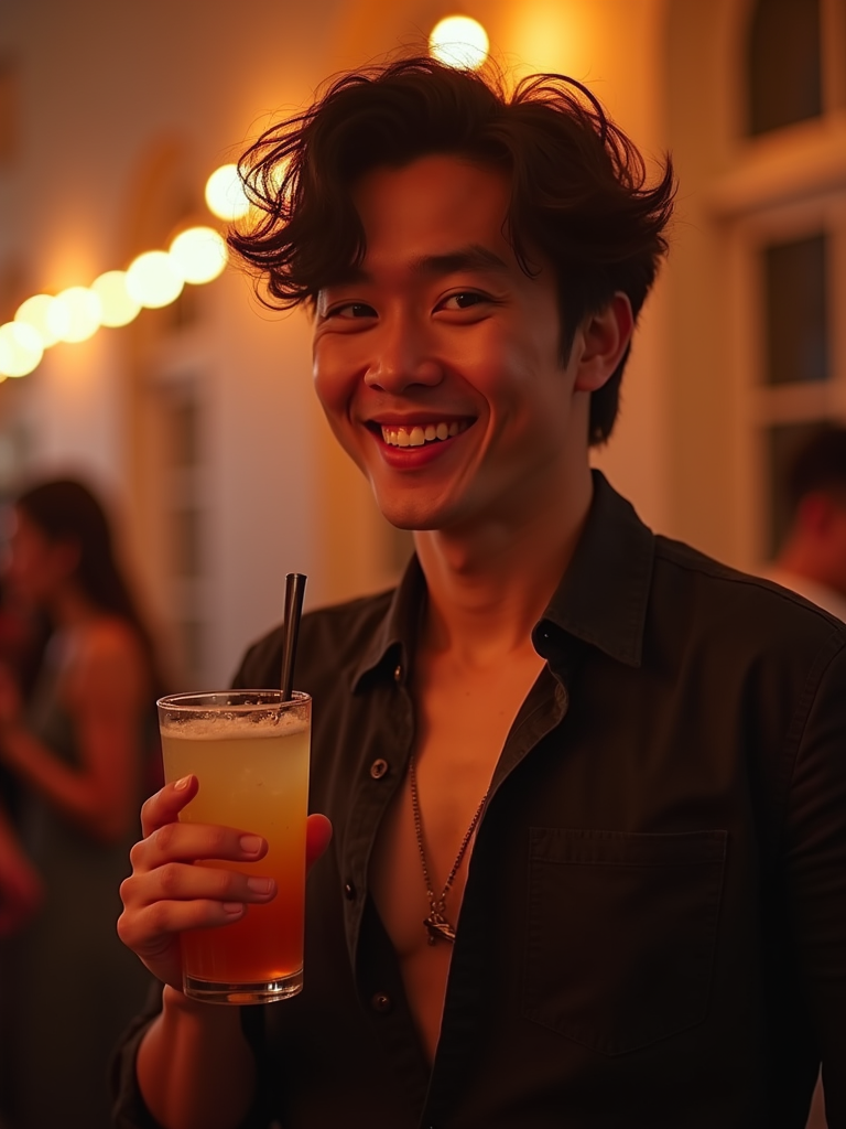 outgoing masculine model at a lively house party, holding a drink and smiling