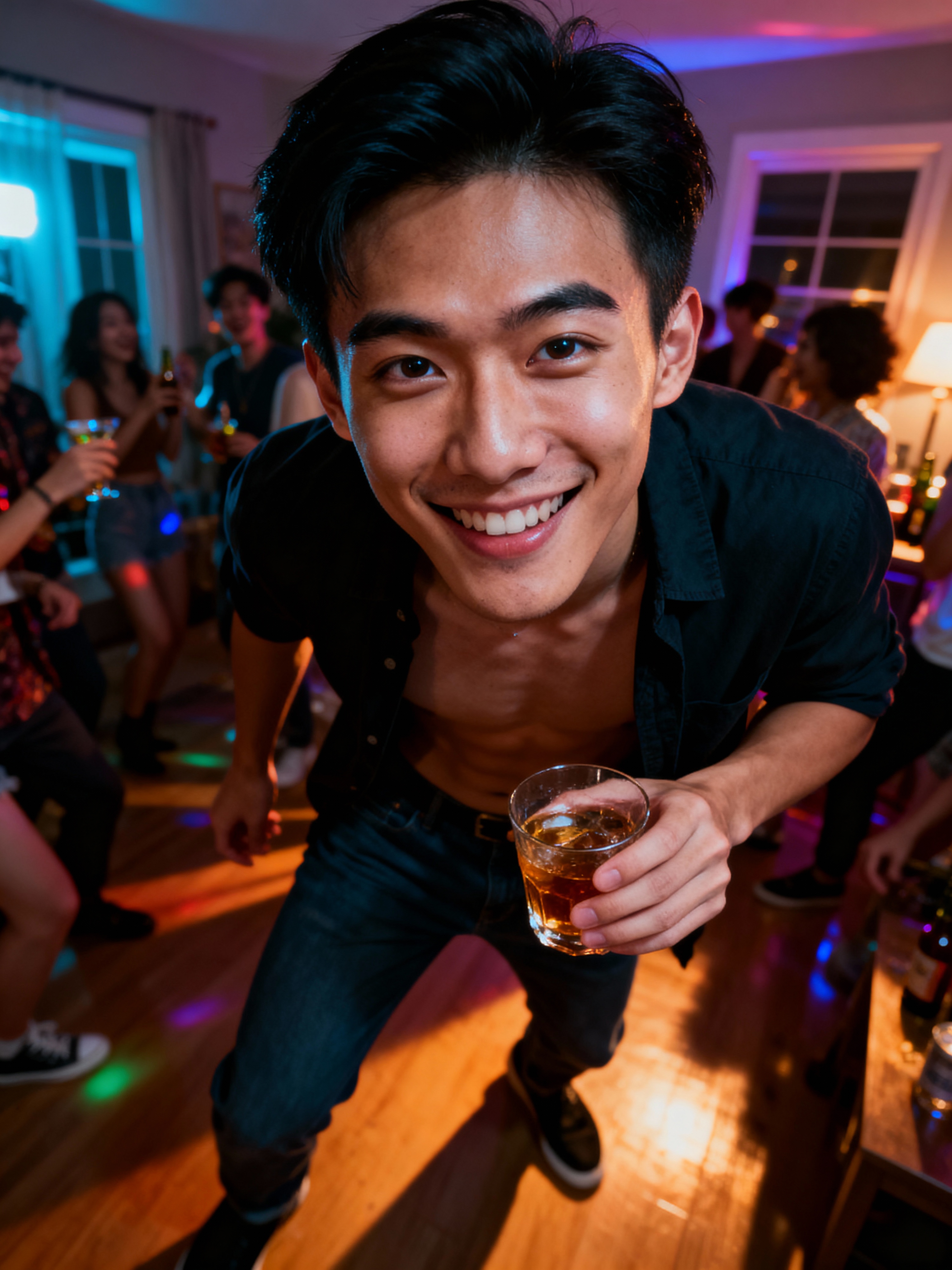 outgoing masculine model at a lively house party, holding a drink and smiling