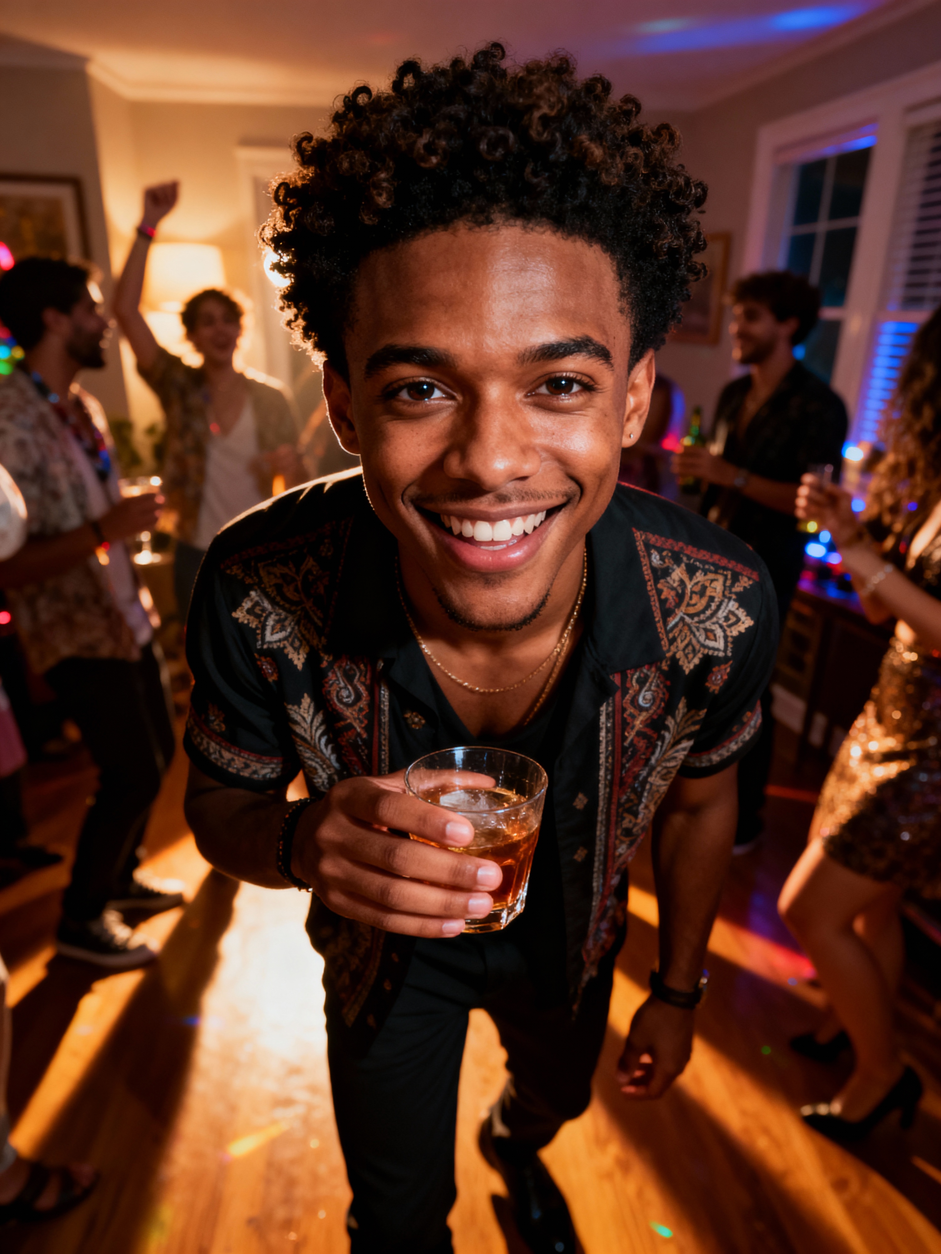 outgoing masculine model at a lively house party, holding a drink and smiling