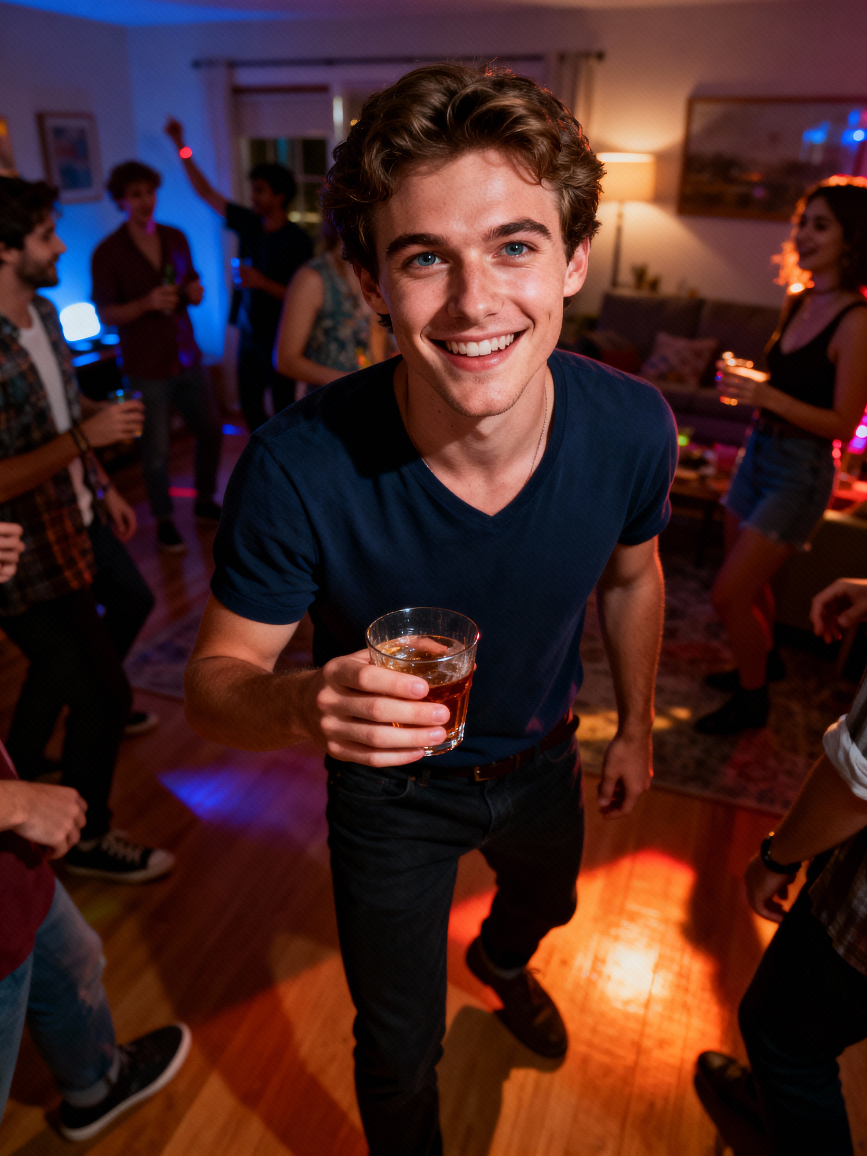 outgoing masculine model at a lively house party, holding a drink and smiling