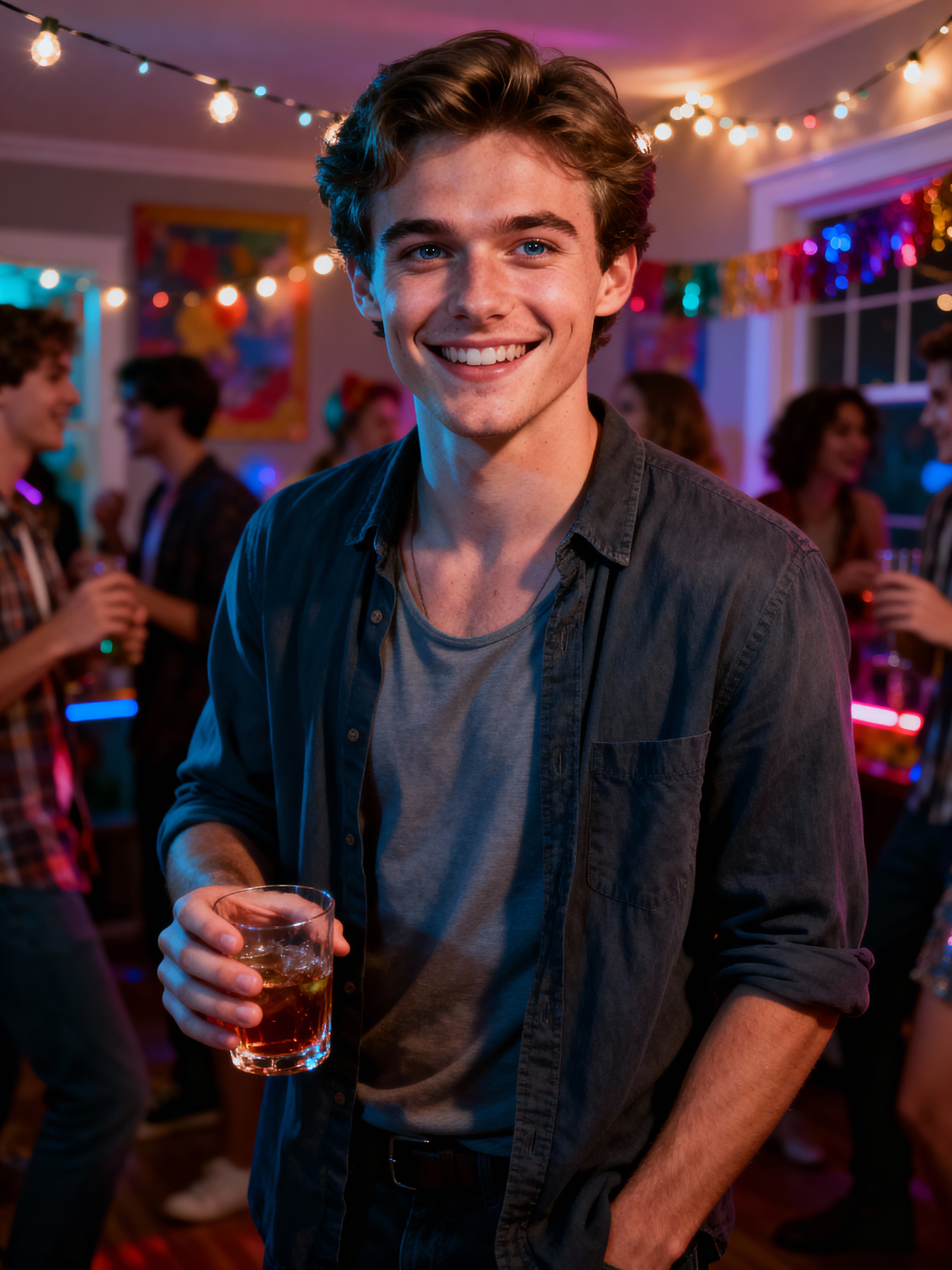 outgoing masculine model at a lively house party, holding a drink and smiling