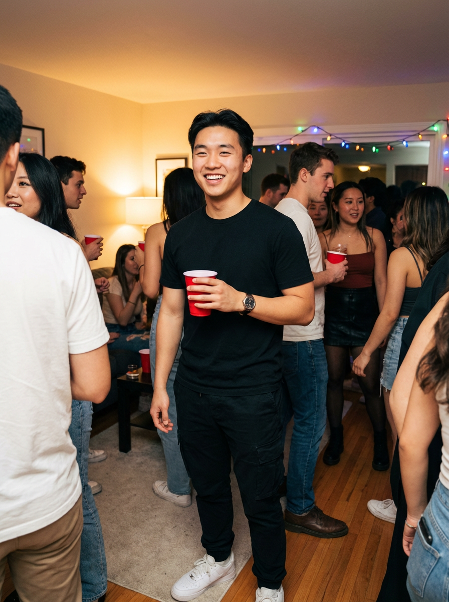 outgoing masculine model at a lively house party, holding a drink and smiling