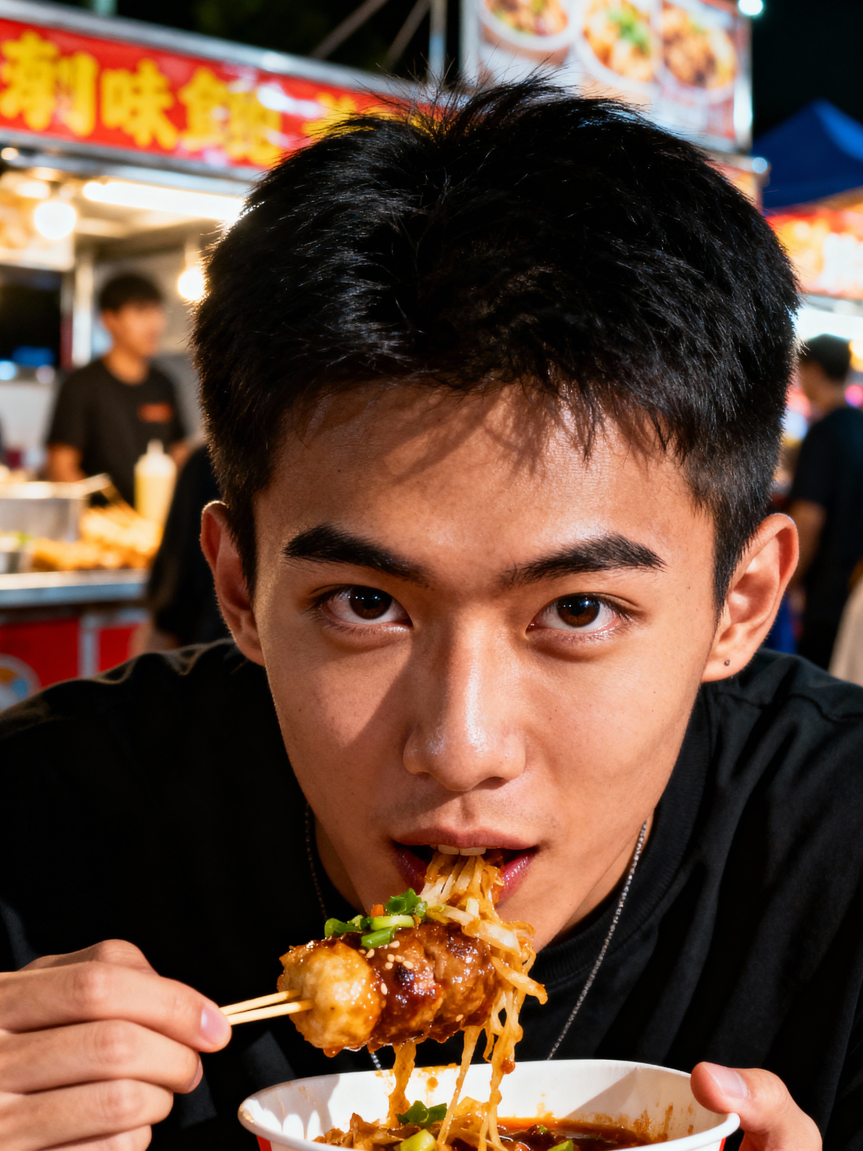 outgoing masculine model savoring street food at a local food truck event