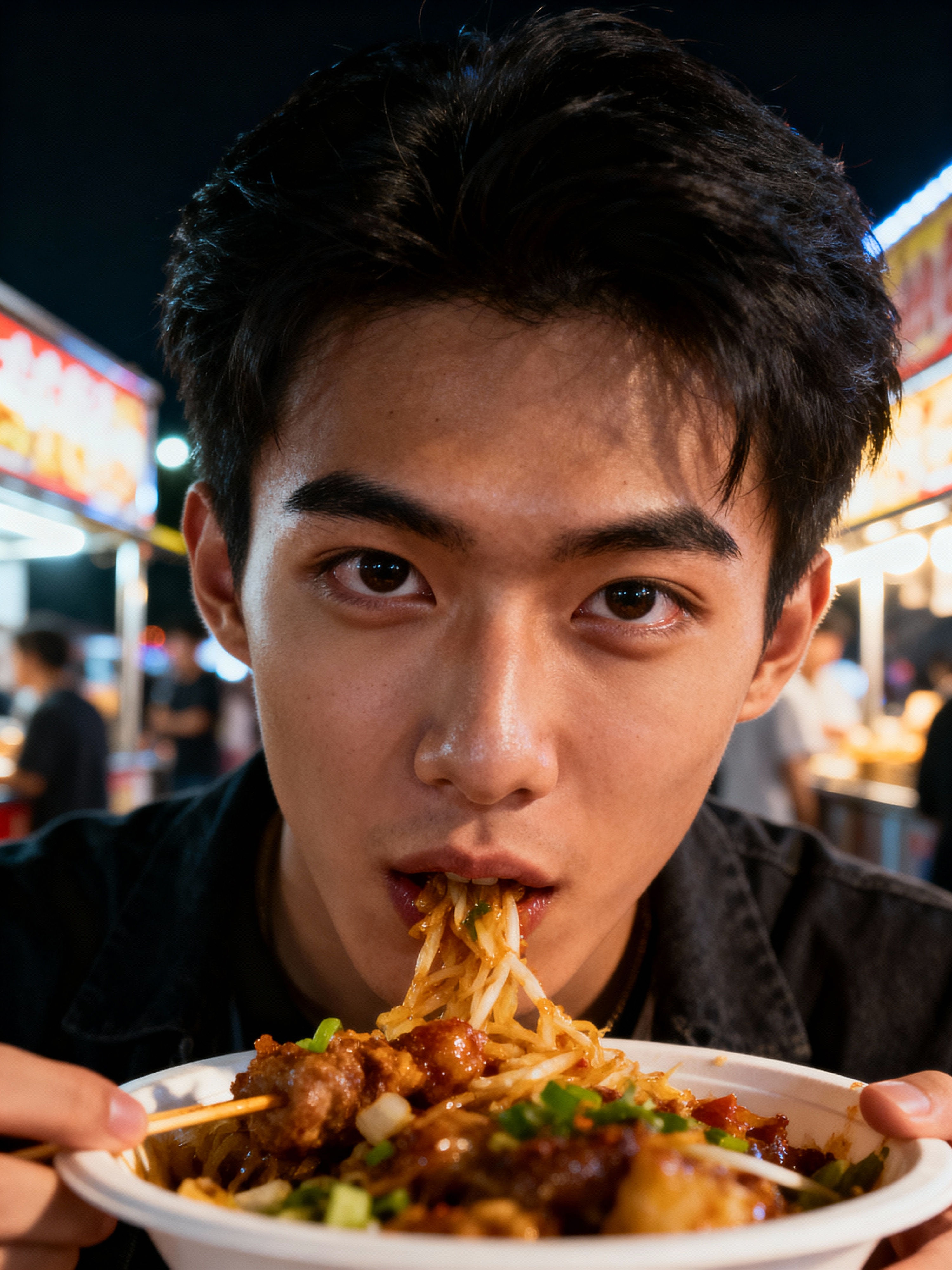 outgoing masculine model savoring street food at a local food truck event