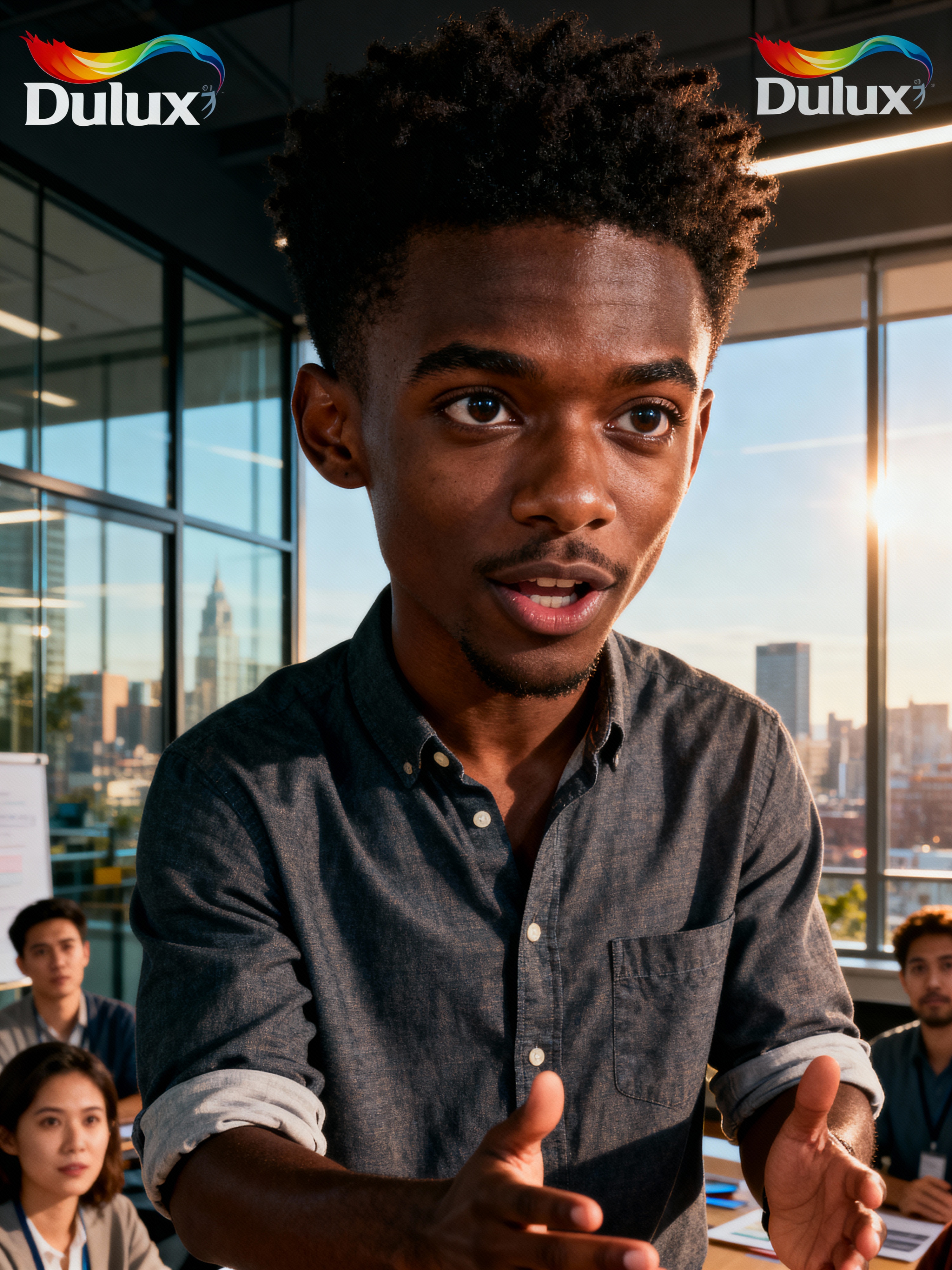 passionate model in smart casual shirt with rolled sleeves leading a team meeting, collaborative environment, glass walls, city view