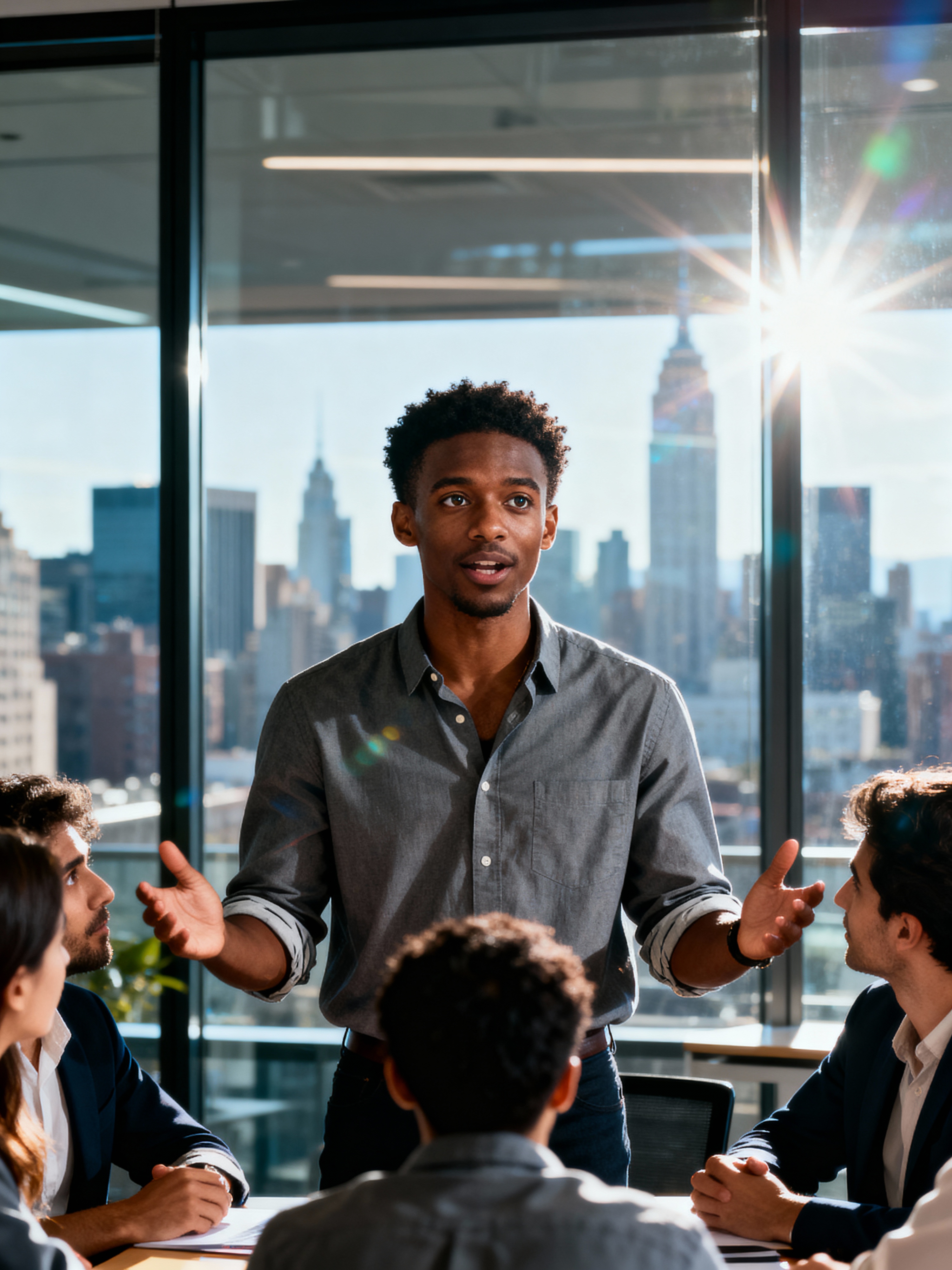 passionate model in smart casual shirt with rolled sleeves leading a team meeting, collaborative environment, glass walls, city view