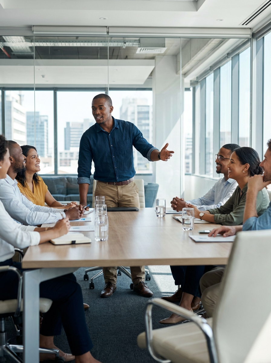 passionate model in smart casual shirt with rolled sleeves leading a team meeting, collaborative environment, glass walls, city view