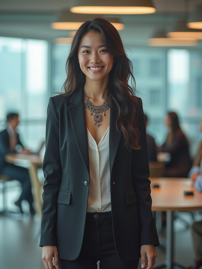 passionate model in modern blazer with statement necklace leading a team meeting, collaborative environment, glass walls, city view