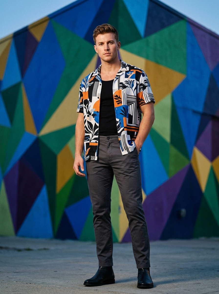 Pattern trend model in graphic print shirt half-unbuttoned over fitted pants against colorful geometric wall at twilight, vibrant studio lighting, high-fashion patterns mood, close-up confident gaze, vogue editorial, 260px