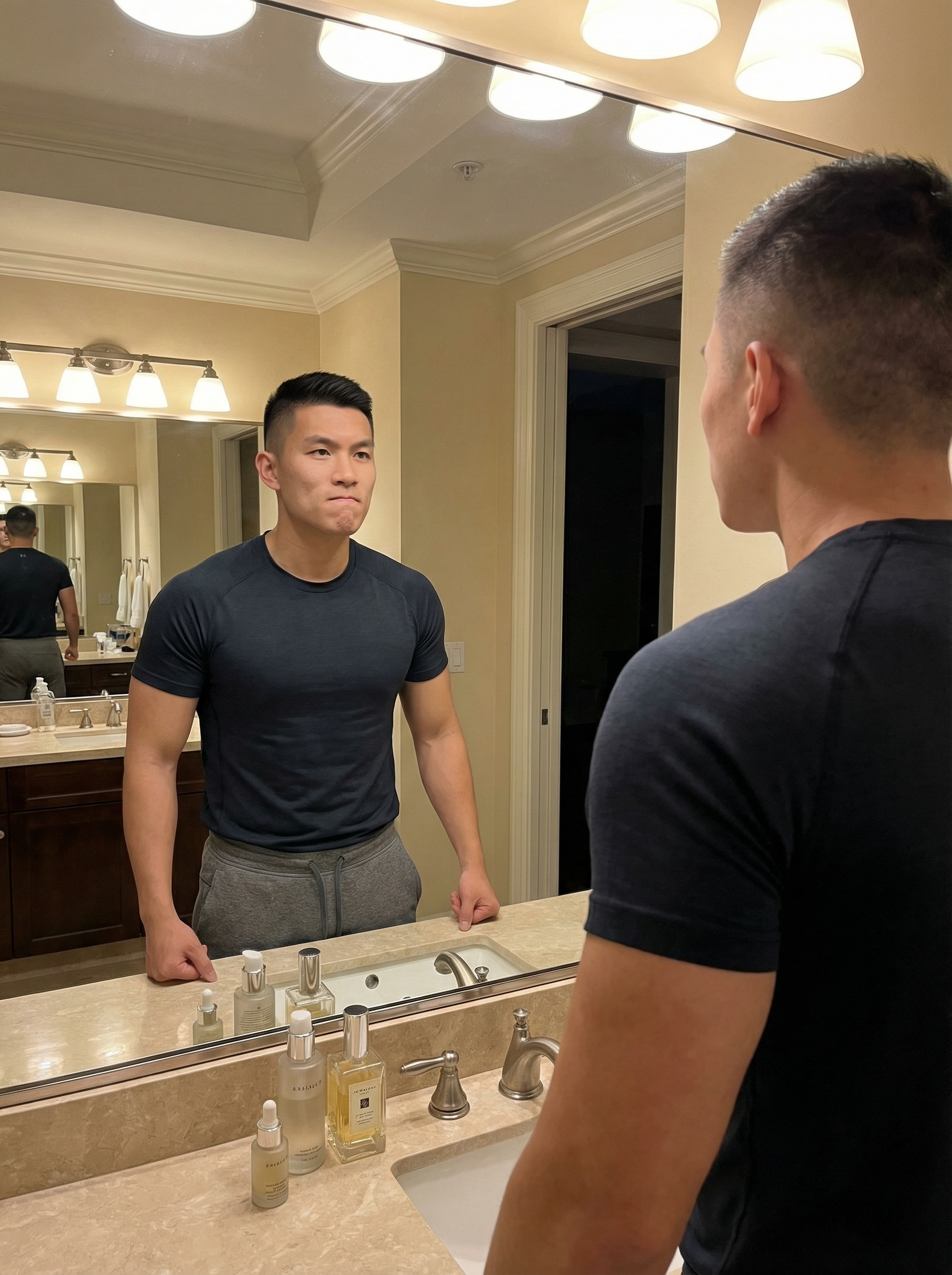 perfect face model, active looksmaxxing, clean fitted gym tee showing muscular build, tapered joggers, fresh haircut, in a modern luxury bathroom mirror, perfect flattering vanity lighting, premium skincare bottles on counter, focused expression, doing subtle facial exercises / tongue posture (mewing) naturally, sharp jaw + defined cheekbones + clear skin + bright eyes, cinematic realism, high detail, vibrant natural colors, no distortion, no text, no watermark.