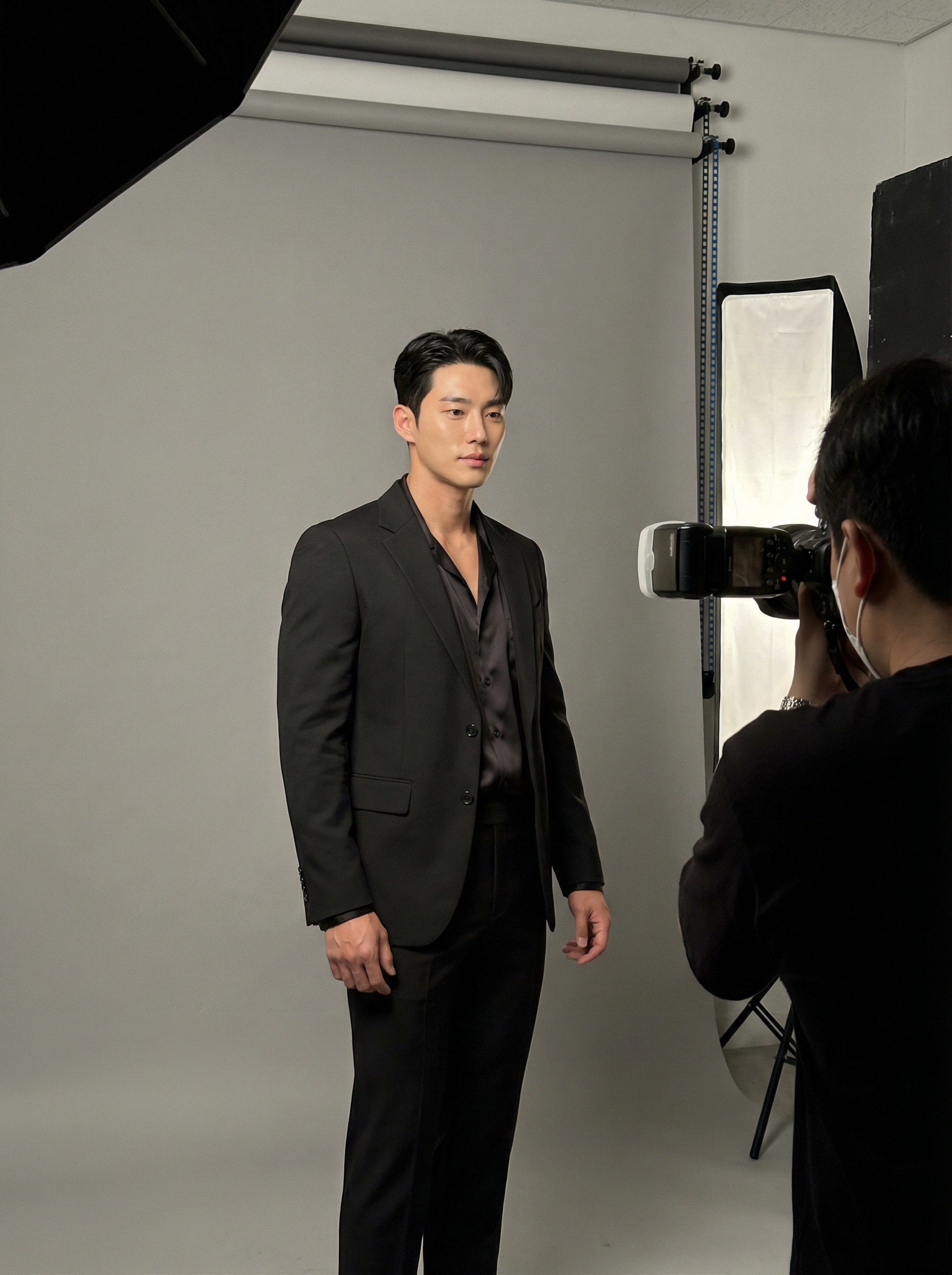 perfect face model, active looksmaxxing, confidence session, high-fashion clean styling showing muscular physique, posing for camera in a studio, photographer directing, perfect flattering lighting, styled hair, clear glowing skin, symmetry + sharp jaw/cheeks, editorial vibe, ultra-detailed realistic textures, vibrant but premium color grade, no text, no watermark.