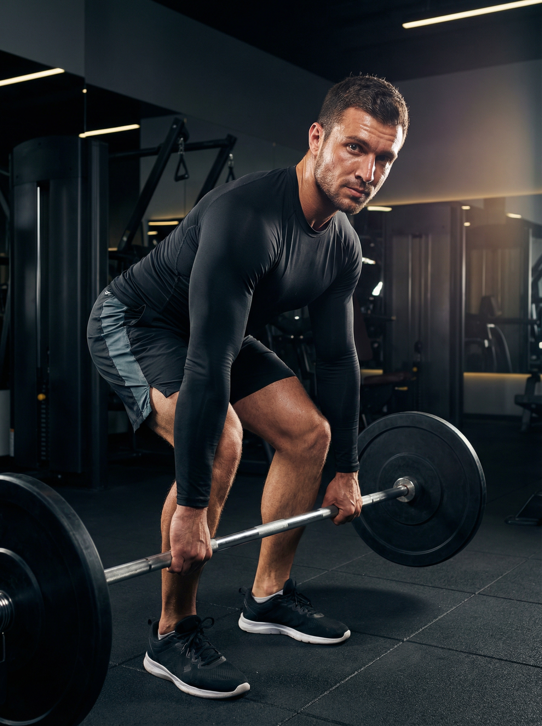 perfect face model, active looksmaxxing, fitness gear showing muscular definition, fitted compression top, at an upscale gym doing compound exercises with perfect form (squat/deadlift/bench), sweat glistening but clean, determined confident expression, lean athletic definition, sharp jaw/cheeks clearly visible, dramatic gym lighting, ultra-detailed photoreal, vibrant but premium color grade, no text, no watermark.