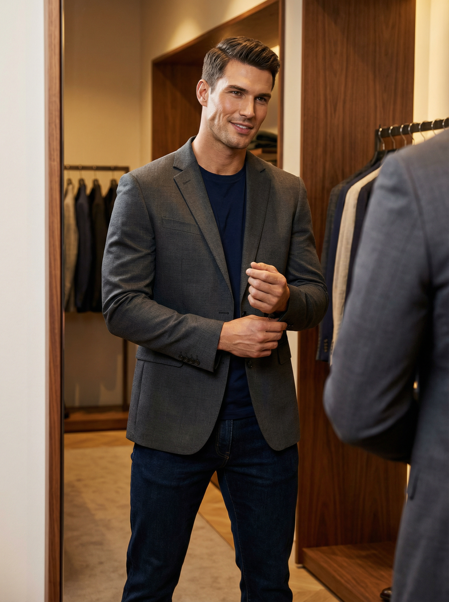 perfect face model, active looksmaxxing, style consultation, perfectly tailored smart-casual outfit showing muscular physique, trying on clothes that fit perfectly, confident poses, boutique lighting, looksmaxxed silhouette and proportions, sharp cheekbones + jawline, high detail fashion editorial photo, vibrant but premium colors, no text, no watermark.