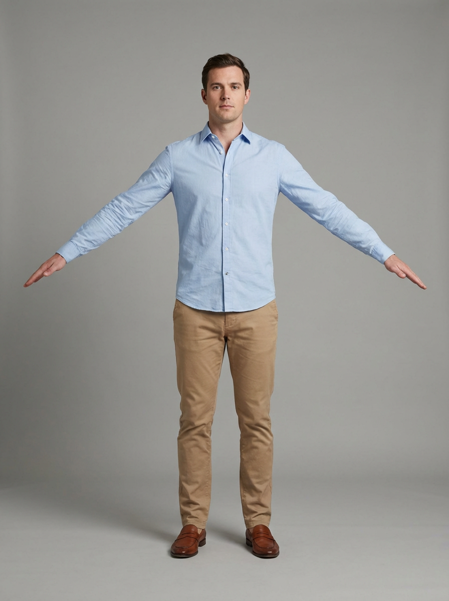 person in T-pose stance, arms outstretched perpendicular to body, facing forward, full figure, anatomically correct proportions, wearing button-up shirt, chinos, loafers, for 3D rigging