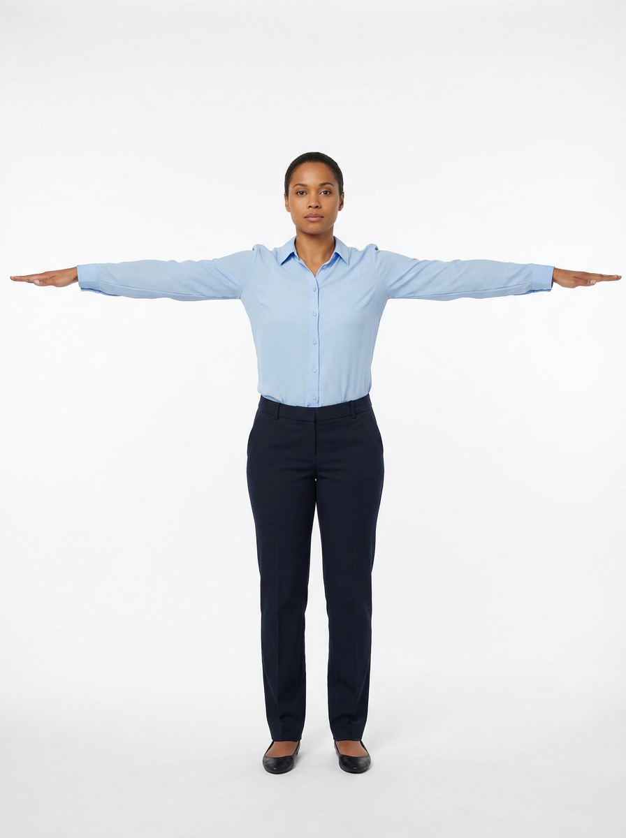 person in T-pose stance, arms outstretched perpendicular to body, facing forward, full figure, anatomically correct proportions, wearing blouse, dress pants, flats , for 3D rigging