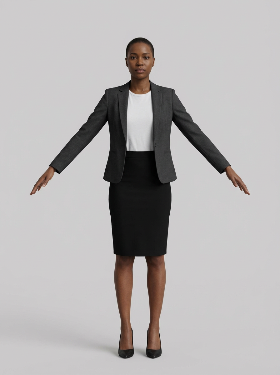person in T-pose stance, arms outstretched perpendicular to body, facing forward, full figure, anatomically correct proportions, wearing blazer, pencil skirt, heels , for 3D rigging