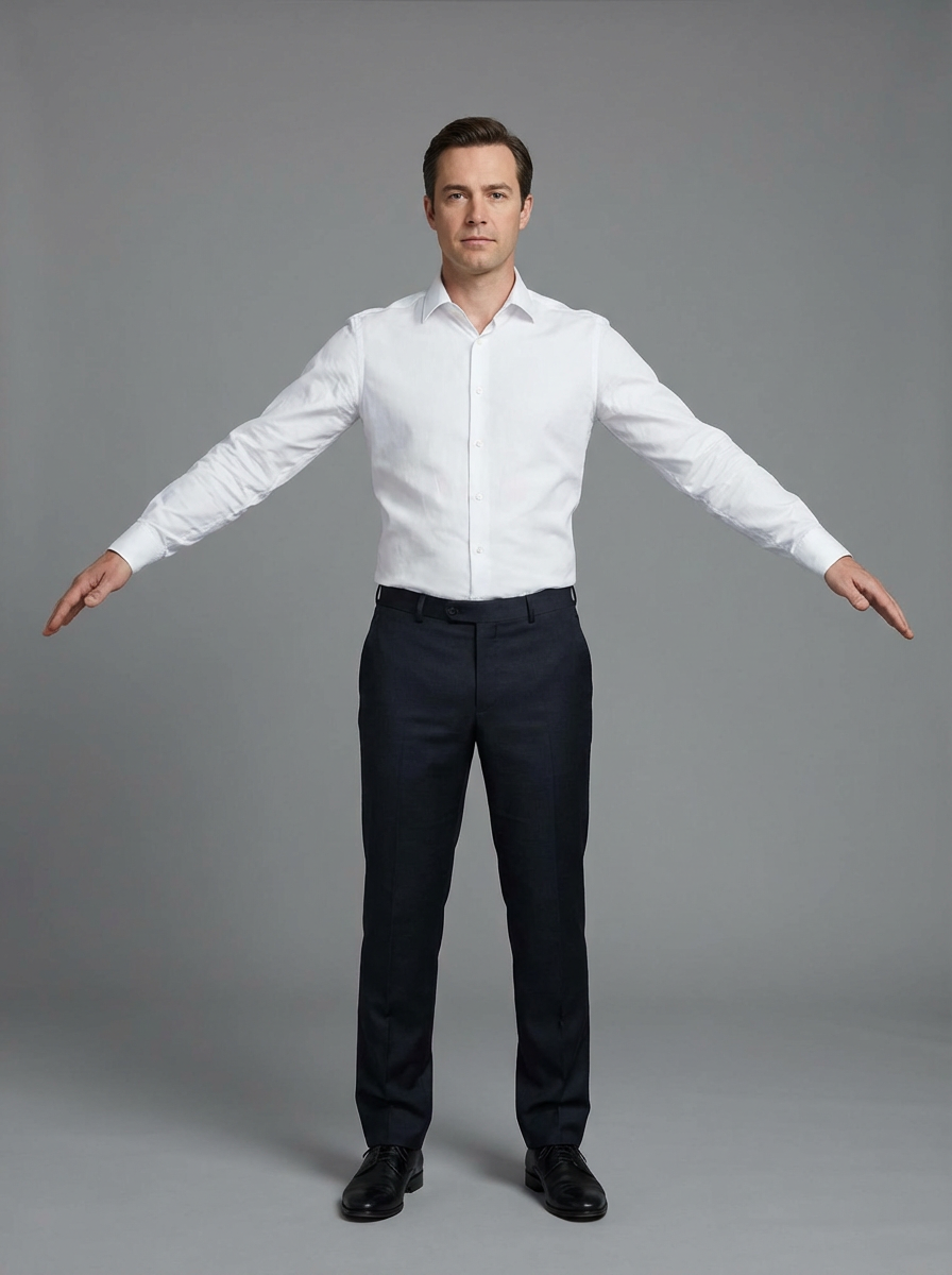 person in T-pose stance, arms outstretched perpendicular to body, facing forward, full figure, anatomically correct proportions, wearing dress shirt, suit pants, dress shoes, for 3D rigging