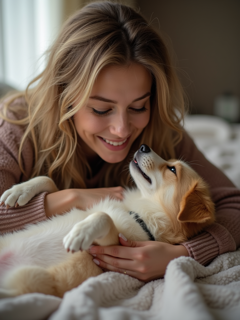 pet-loving feminine model happily playing with a dog or cat