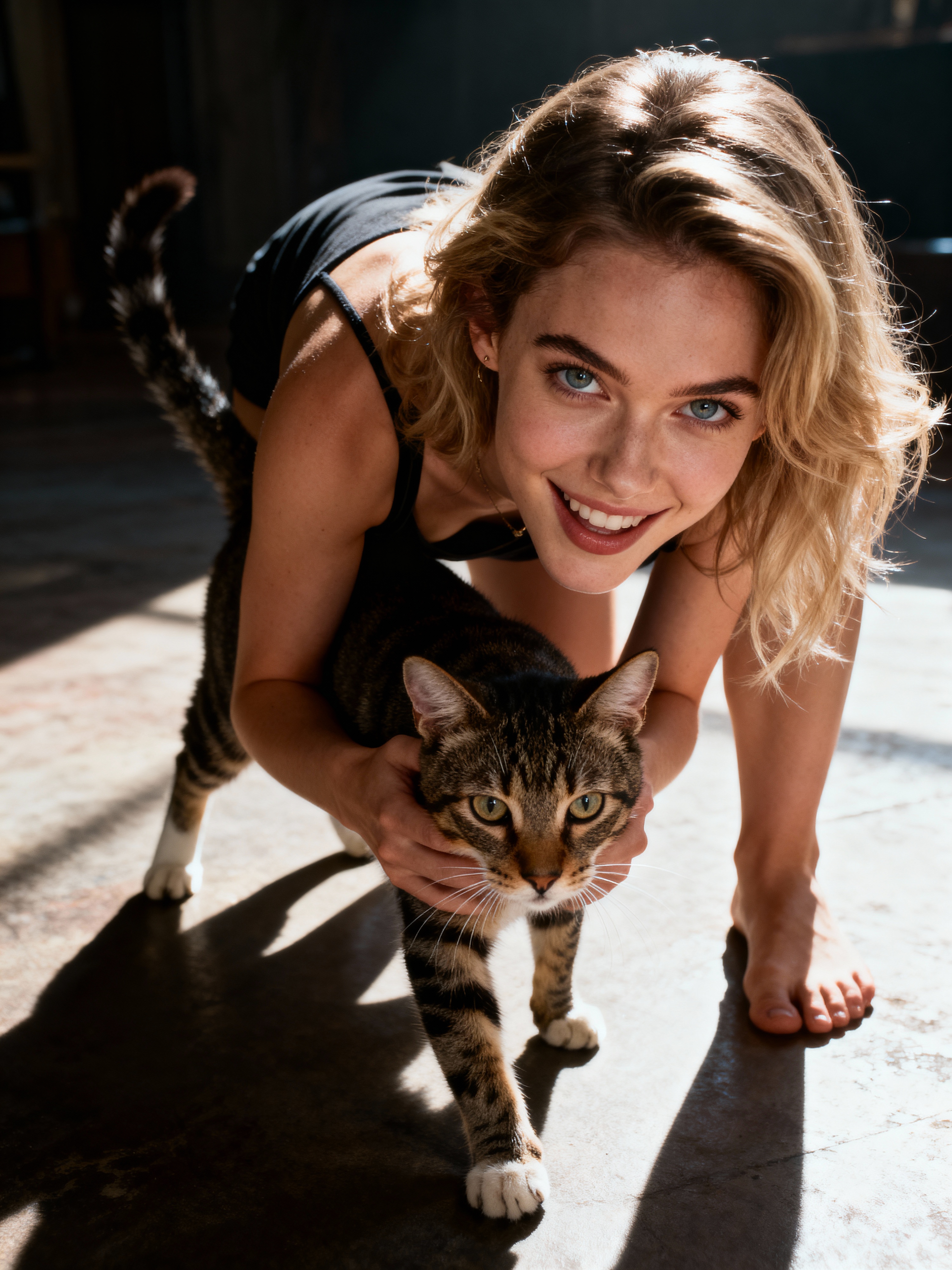 pet-loving feminine model happily playing with a dog or cat