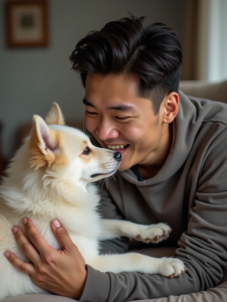 pet-loving masculine model happily playing with a dog or cat
