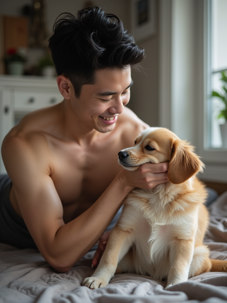 pet-loving masculine model happily playing with a dog or cat