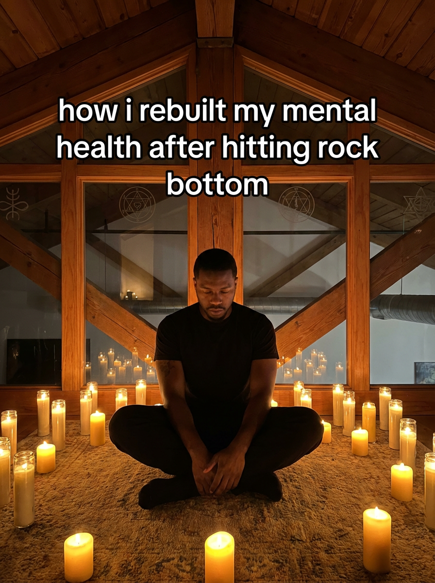 photograph of model in a tranquil loft, warm amber glow from dozens of flickering candles, ornate sacred symbols etched in wood and glass, TikTok-style text overlay with white text with black outline: "how i rebuilt my mental health after hitting rock bottom", do not show tiktok interface or logo