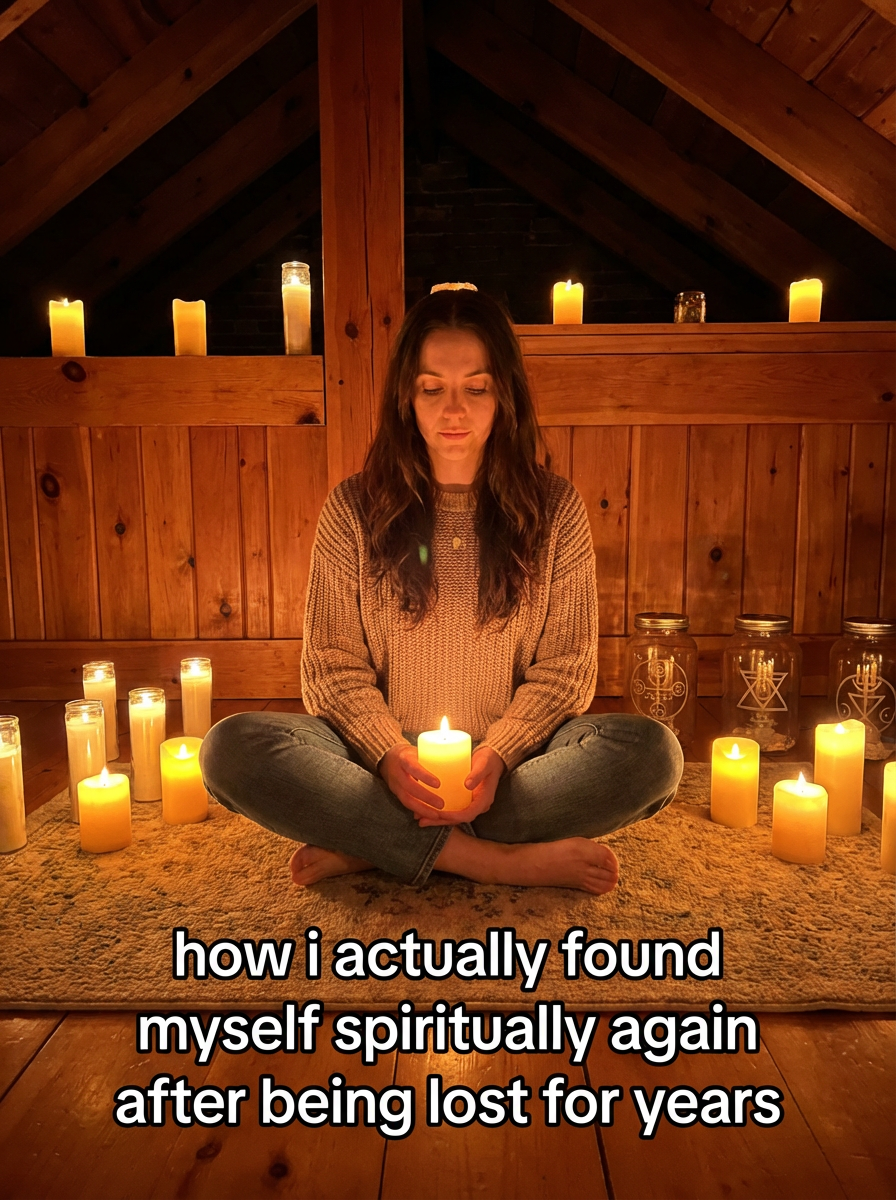 photograph of model in a tranquil loft, warm amber glow from dozens of flickering candles, ornate sacred symbols etched in wood and glass, TikTok-style text overlay with white text with black outline: "how i actually found myself spiritually again after being lost for years" , do not show tiktok interface or logo