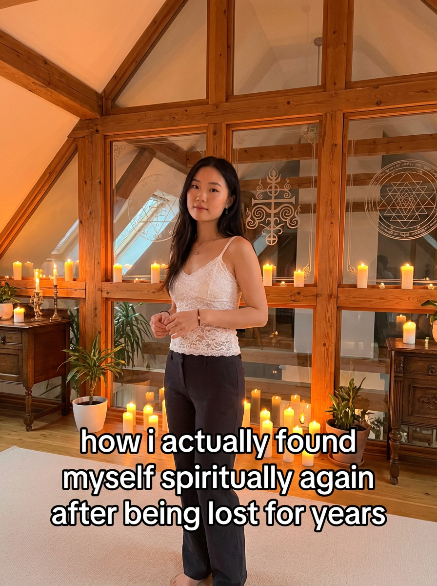 photograph of model in a tranquil loft, warm amber glow from dozens of flickering candles, ornate sacred symbols etched in wood and glass, TikTok-style text overlay with white text with black outline: "how i actually found myself spiritually again after being lost for years" , do not show tiktok interface or logo