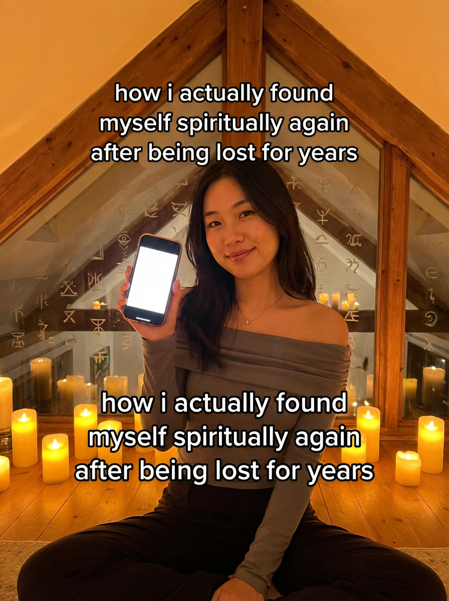photograph of model in a tranquil loft, warm amber glow from dozens of flickering candles, ornate sacred symbols etched in wood and glass, TikTok-style text overlay with white text with black outline: "how i actually found myself spiritually again after being lost for years" , do not show tiktok interface or logo