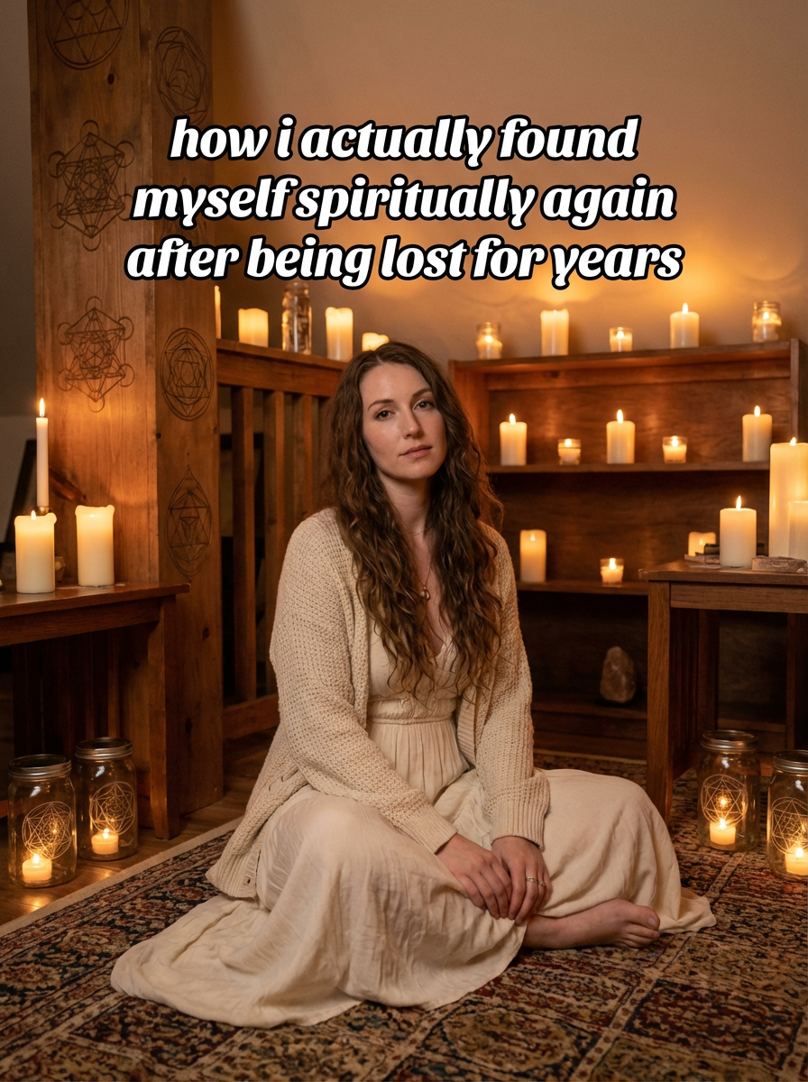 photograph of model in a tranquil loft, warm amber glow from dozens of flickering candles, ornate sacred symbols etched in wood and glass, TikTok-style text overlay with white text with black outline: "how i actually found myself spiritually again after being lost for years" , do not show tiktok interface or logo