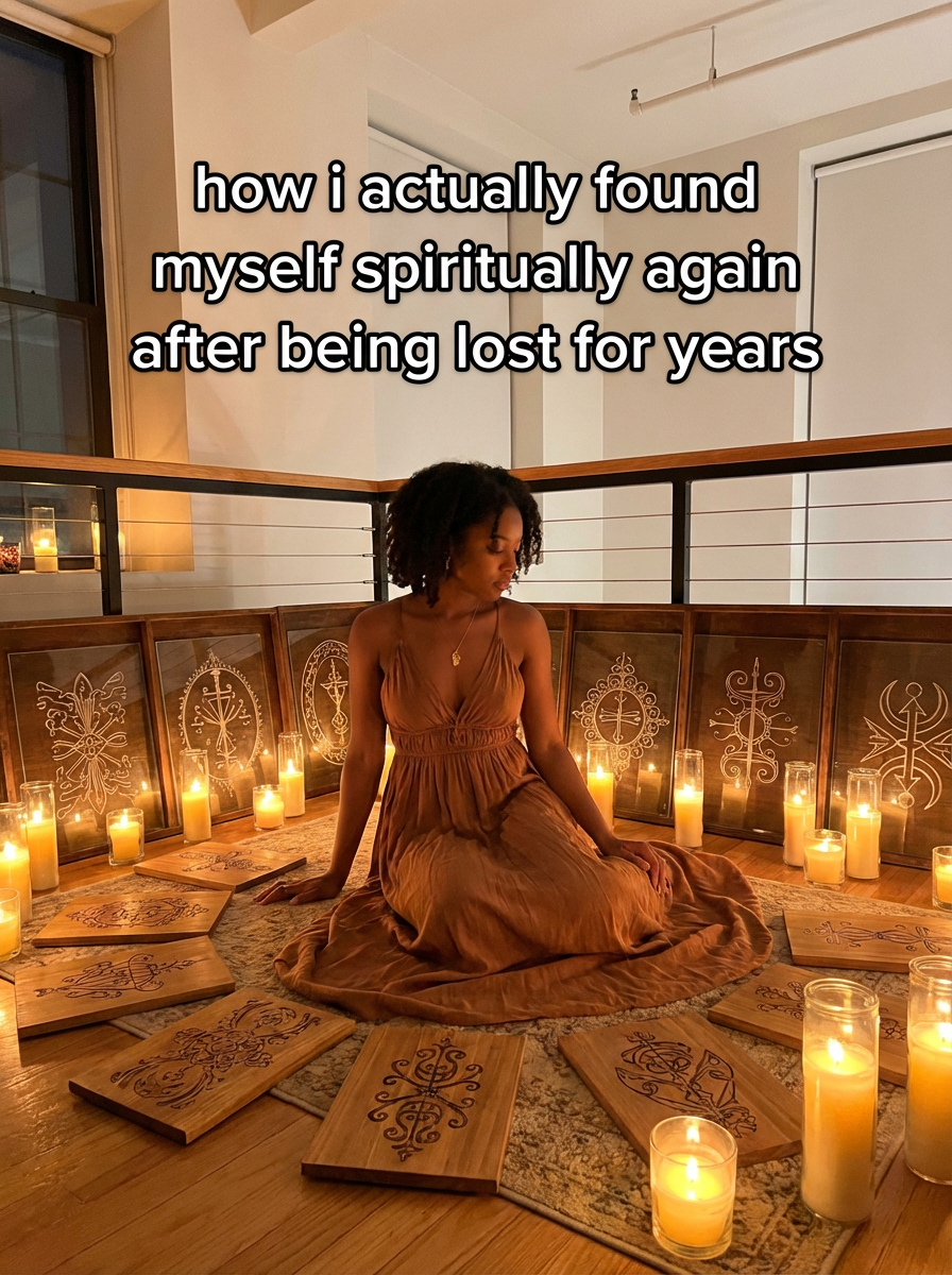 photograph of model in a tranquil loft, warm amber glow from dozens of flickering candles, ornate sacred symbols etched in wood and glass, TikTok-style text overlay with white text with black outline: "how i actually found myself spiritually again after being lost for years" , do not show tiktok interface or logo