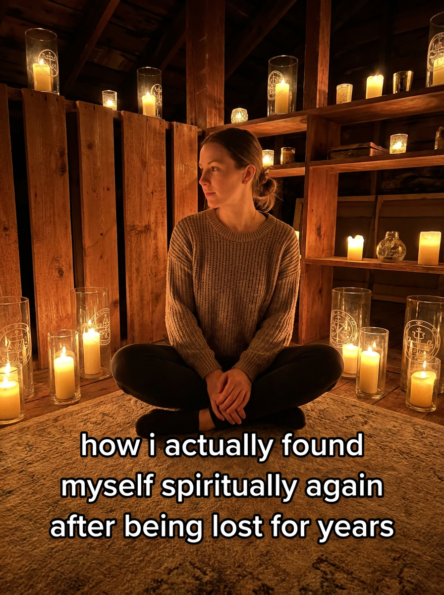 photograph of model in a tranquil loft, warm amber glow from dozens of flickering candles, ornate sacred symbols etched in wood and glass, TikTok-style text overlay with white text with black outline: "how i actually found myself spiritually again after being lost for years" , do not show tiktok interface or logo