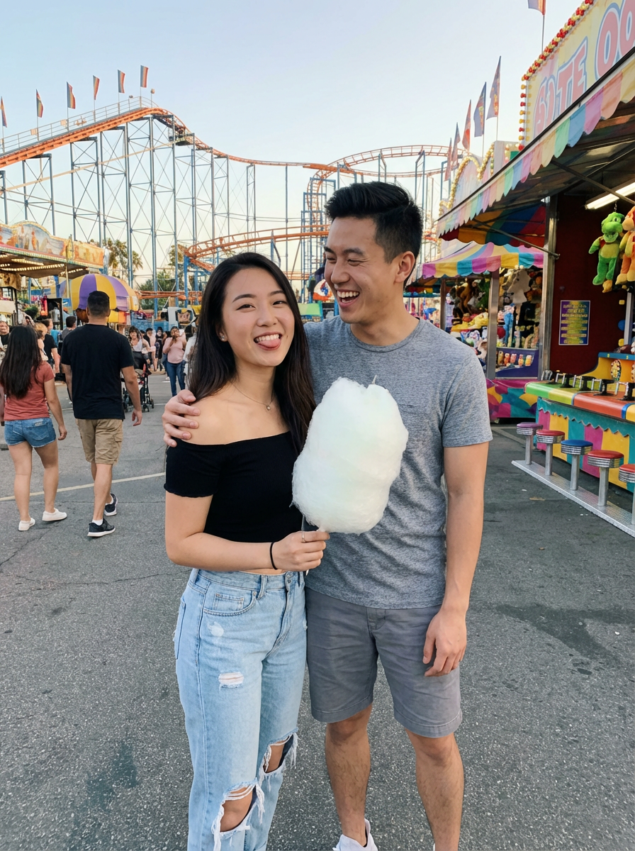 playful photo of model and boyfriend at amusement park, fun expressions, casual date outfits, vibrant atmosphere