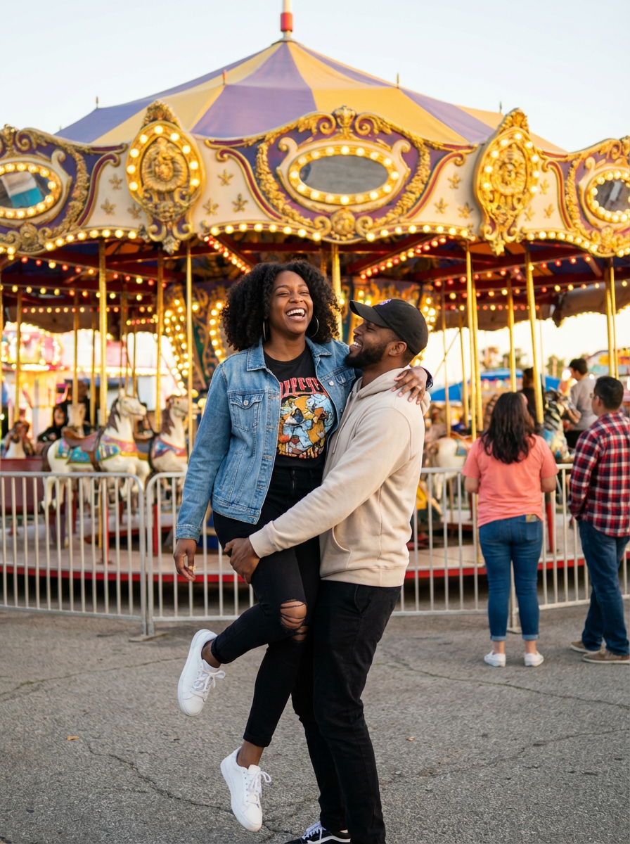 playful photo of model and boyfriend at amusement park, fun expressions, casual date outfits, vibrant atmosphere