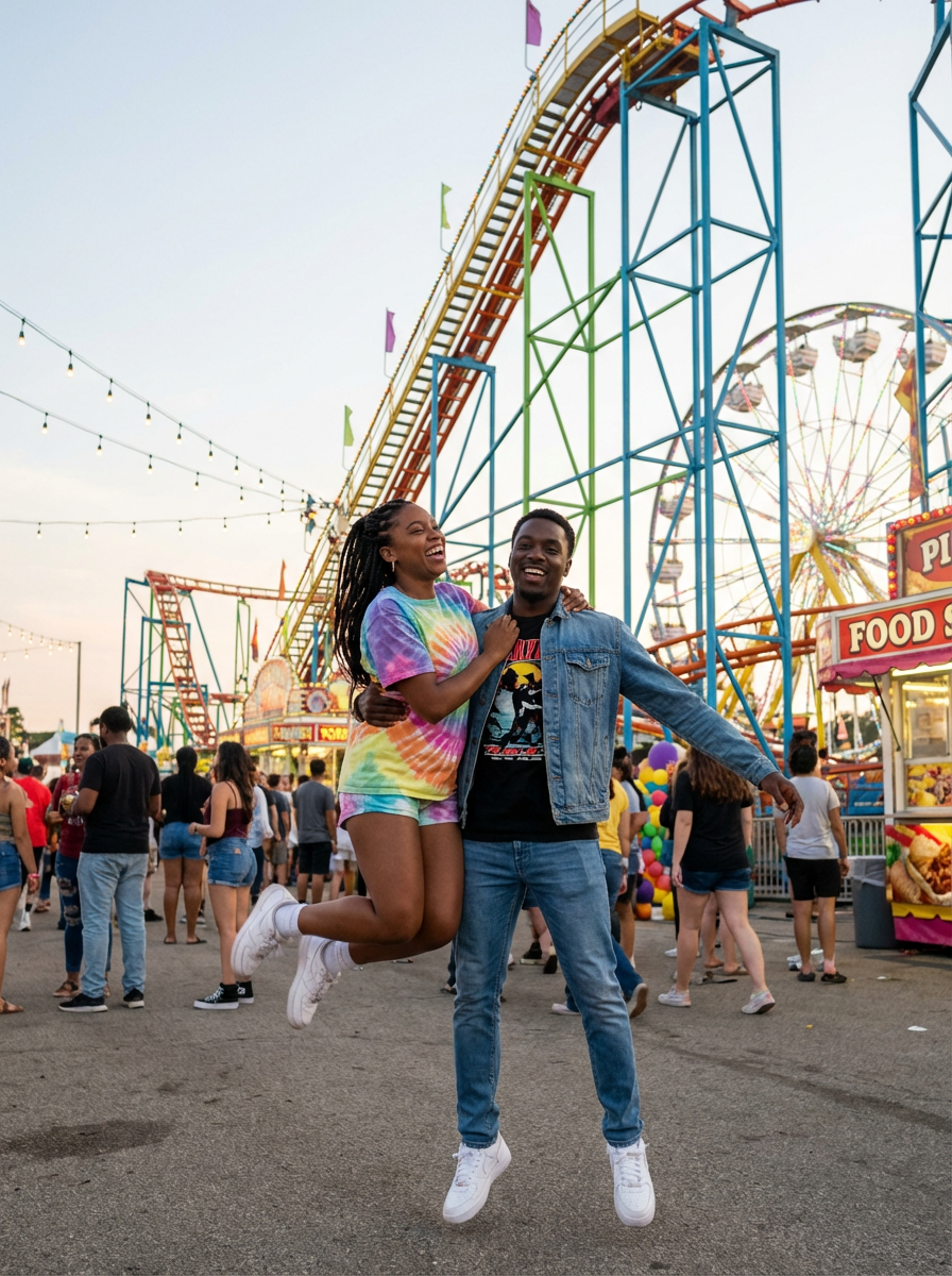playful photo of model and boyfriend at amusement park, fun expressions, casual date outfits, vibrant atmosphere