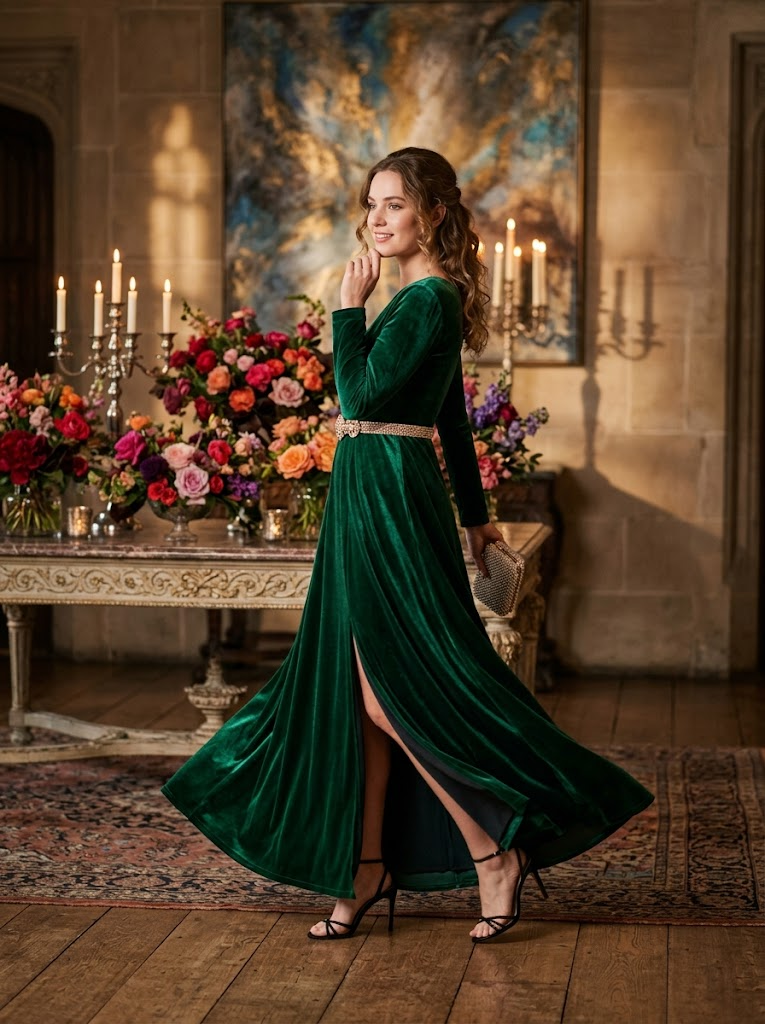 Poised model in flowing long gown beside opulent table of vibrant flowers, abstract painting backdrop, emerald velvet dress with slit , elegant turn, soft romantic lighting, candle glow, high-society mood, Vogue-style portrait, intricate details.
