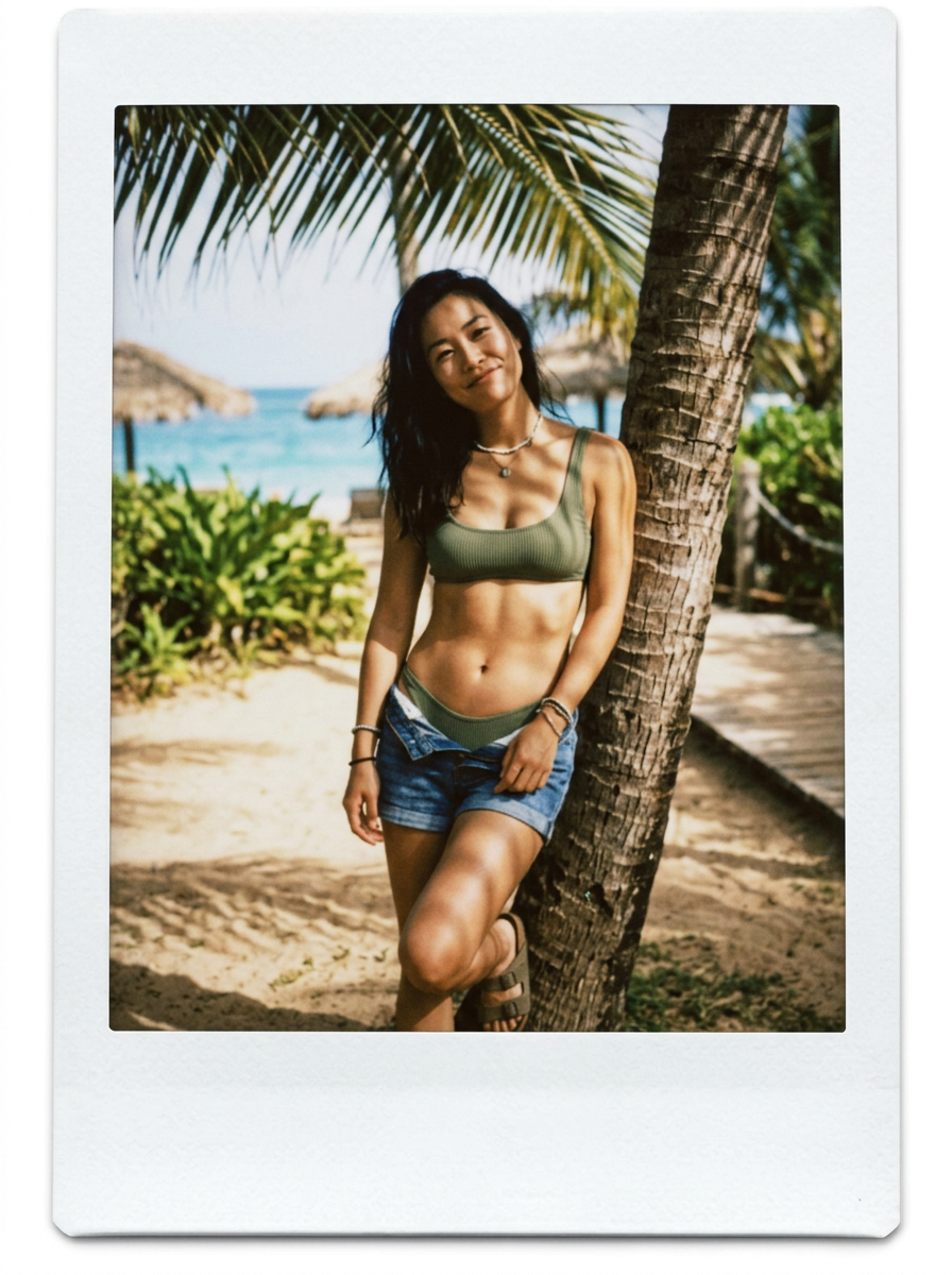 Polaroid-style sexy model with large chest in Frankies Bikini x Gigi, flat stomach and toned abs on display, casual beach lean against palm tree, natural Kauai light filtering through leaves, playful smirk, vintage film grain effect with modern high-res, full-body portrait, alluring resort vibe.