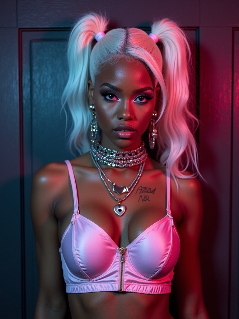 Portrait of a confident, edgy platinum blonde model styled in playful, provocative pastel pink strappy lingerie with satin texture and gold hardware details. Her hair is styled in high twin pigtails with soft pink and blue tips, and she wears bold eye makeup with a small black heart beneath one eye. She stands against a dark vintage paneled wall under moody magenta and violet lighting. Visible tattoos, layered silver chain necklaces, and a teasing expression complete the punk-inspired, rebellious aesthetic.