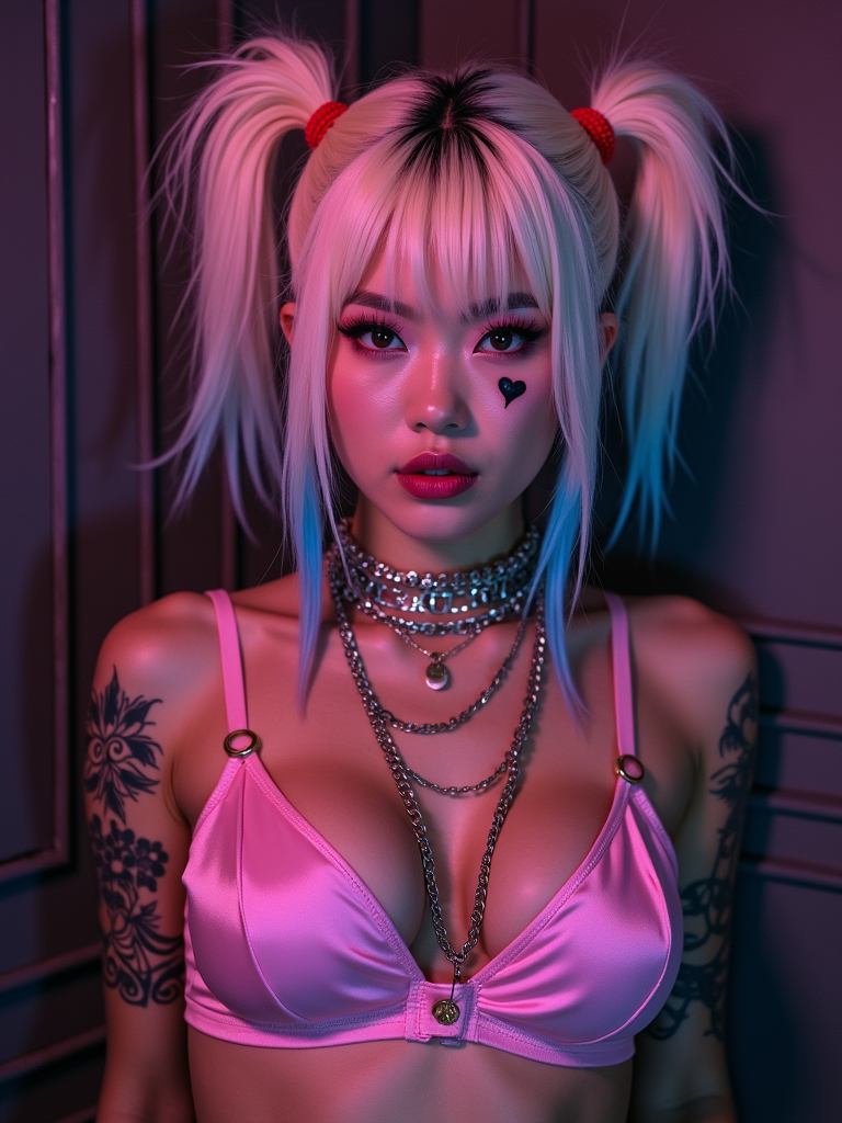 Portrait of a confident, edgy platinum blonde model styled in playful, provocative pastel pink strappy lingerie with satin texture and gold hardware details. Her hair is styled in high twin pigtails with soft pink and blue tips, and she wears bold eye makeup with a small black heart beneath one eye. She stands against a dark vintage paneled wall under moody magenta and violet lighting. Visible tattoos, layered silver chain necklaces, and a teasing expression complete the punk-inspired, rebellious aesthetic.