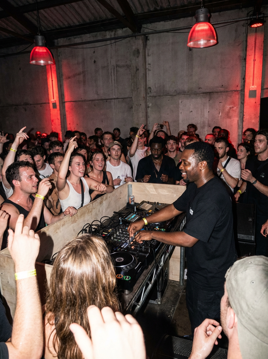 POV from audience: model as DJ at Boiler Room session, intimate warehouse setting, close-up crowd surrounding DJ booth, no barrier between artist and audience, industrial concrete walls, minimal red lighting, packed intimate crowd, authentic underground atmosphere, handheld camera aesthetic, raw documentary style, only show one DJ