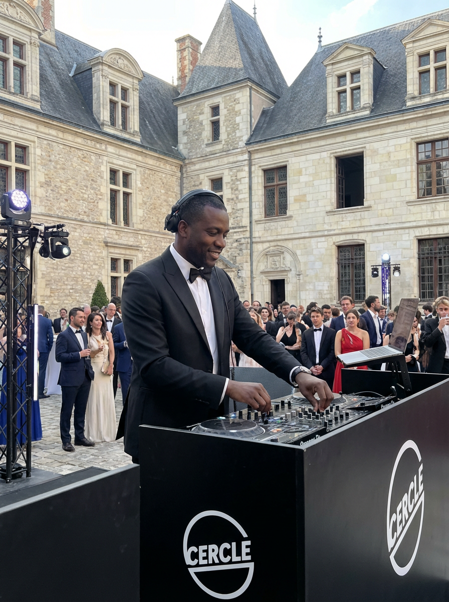 POV from audience: model as DJ at Cercle event inside French castle, historic stone architecture, grand hall with vaulted ceilings, ornate medieval details, DJ setup in castle courtyard, elegant crowd in historic setting, dramatic castle lighting, Renaissance backdrop, intimate aristocratic atmosphere, only show one DJ